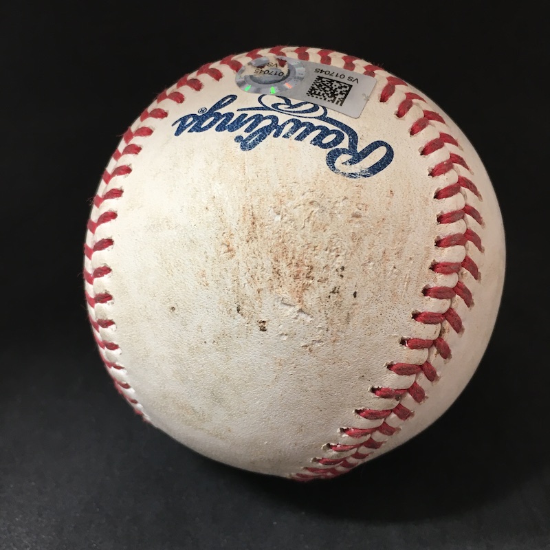 What's Buzz-worthy: This ball's lifespan was two pitches per its MLB Authentication (in gallery below) -- a fastball that got a look and a curveball that caused all that scuffing and meant its demise. I found this one in the Phillies bargain bin -- that $10 price even included a ball cube -- and thanks to the MLB Film Room clips here you can see it in action. Ironically, it's from the same game as a previous ball I've thrown into this series while I was just looking for good names and it's the second one I own where it was a simple curveball in the dirt that gets immediately handed back to the ump by catcher J.T. Realmuto. Are there any particular milestones here? Nope, but Ronald Acuña Jr. and Ozzie Albies both homered in the loss. (Note: The sticker is missing some silver on there, but it came straight from the ballpark via the Phillies so it's nothing I'd worry about.)