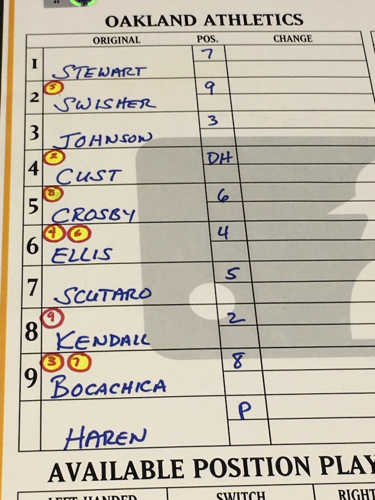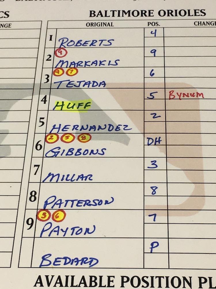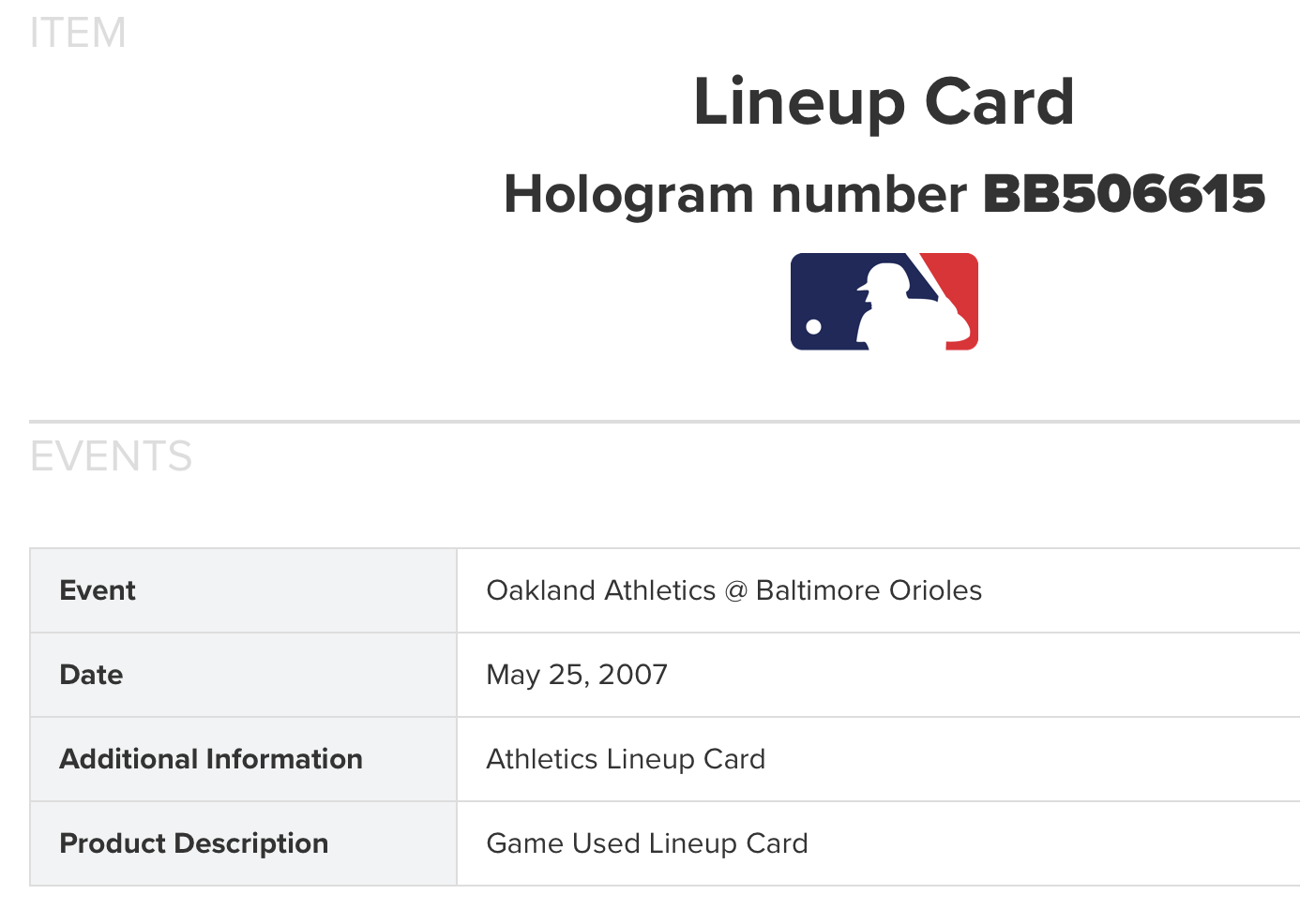 Game-used lineup card (MLB Authenticated): Oakland A's at Baltimore Orioles -- May 25, 2007