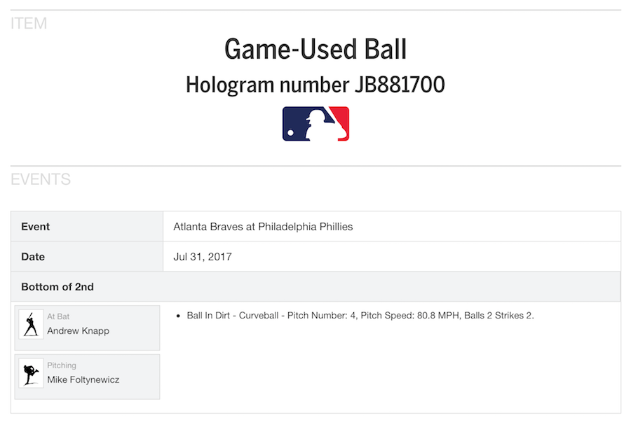 Game-used baseball (MLB Authenticated): Atlanta Braves vs. Philadelphia Phillies, July 31, 2017
