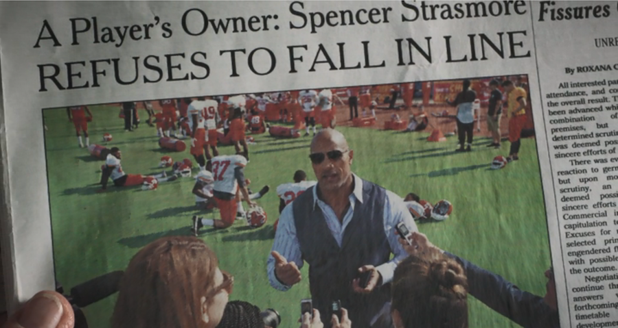 What's Buzz-worthy: This series had a bit of an abrupt ending but still ended with a pivotal point where the former player turned Kansas City Chiefs owner Spencer Strasmore (Dwayne Johnson) went to the media -- reporter Maileen Matthews is named in a scene for an interview and seen on the byline here -- and had a Times cover story exposing some of the NFL's dirty laundry as he faced threats against him as he pushed to get their players lifetime health care benefits on the day of an owners meeting and vote. In a pivotal scene in the finale, the Dallas Cowboys owner (played by actor Christopher McDonald ... Shooter McGavin!) is on his jet reading a copy of the newspaper with this story and then folds it as he leaves the plane. A few more copies are seen among the tables of owners waiting in an airport hanger before a Strasmore monolog and vote where, indeed, they did the right thing for the players and to avoid a strike that Strasmore had backed. (HBO hasn't put the episode anywhere online or I'd embed it all here for you to see ... but the episode time is noted above and some screenshots are below.) Now, of course, this isn't the actual copy McDonald used -- well, it could be but there's no way to prove that -- and the company selling the props now has multiple copies available (I own three since they were dramatically discounted) But, they're definitely legit off-the-press copies with a printed front and back page wrapped around a section of the Los Angeles Times -- that's probably where they were printed for the production company. How many were made? Probably not a ton but probably a bundle or two as presses will run for a bit before being done. Newpapers aren't the easiest things to collect and store with their size and the paper but for this cool piece -- less than the price of a blaster box of cards -- I'll try. It'd be a fun autographed item, too, though newsprint also isn't that friendly there. Sure, it's not game-used ... but it's a piece of Ballers history.