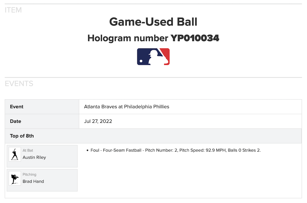 Game-used ball (MLB Authenticated): Atlanta Braves vs. Philadelphia Phillies, July 27, 2022