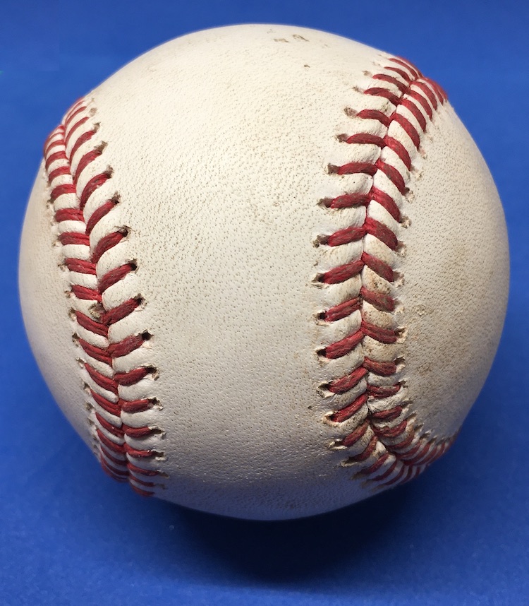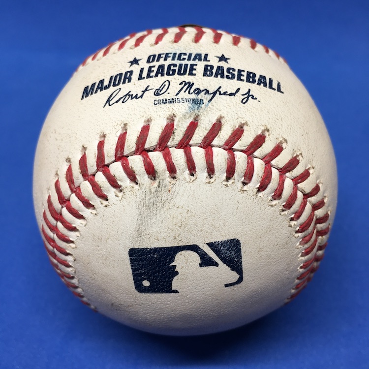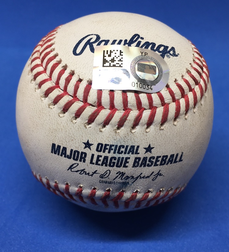 What's Buzz-worthy: This ball has all kinds of star power attached -- everybody involved has been an All-Star -- and it's also a one-pitch lifer in the bigs with perhaps the scar to show it. That mark on an otherwise remarkably clean ball? It just might be from the point of impact where it hit Realmuto's mask bars as Riley fouled it right back at him ... in the face. It was a sequence you can see at he link above that got him a pat on the back from the Riley as Realmuto leaned over and made sure he wasn't spitting any chiclets (teeth) like might happen elsewhere in Philly. After all that, he simply shakes his head and readies for the next pitch. I don't even need to look up any more stats after that one to make this ball seem more interesting or notable than it is ... just roll the tape.