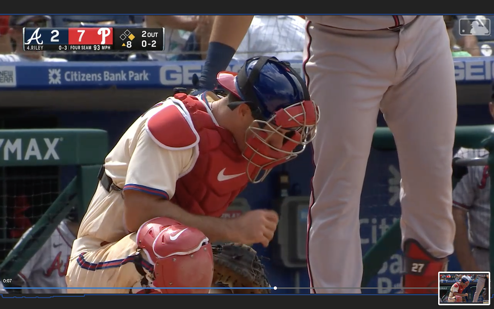 The result: One pitch -- the second foul ball of an at-bat -- in a clean eighth inning as part of a 7-2 Phillies win ... but it also was a 92 mph fastball fouled back straight into catcher J.T. Realmuto's face.