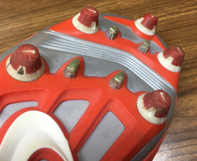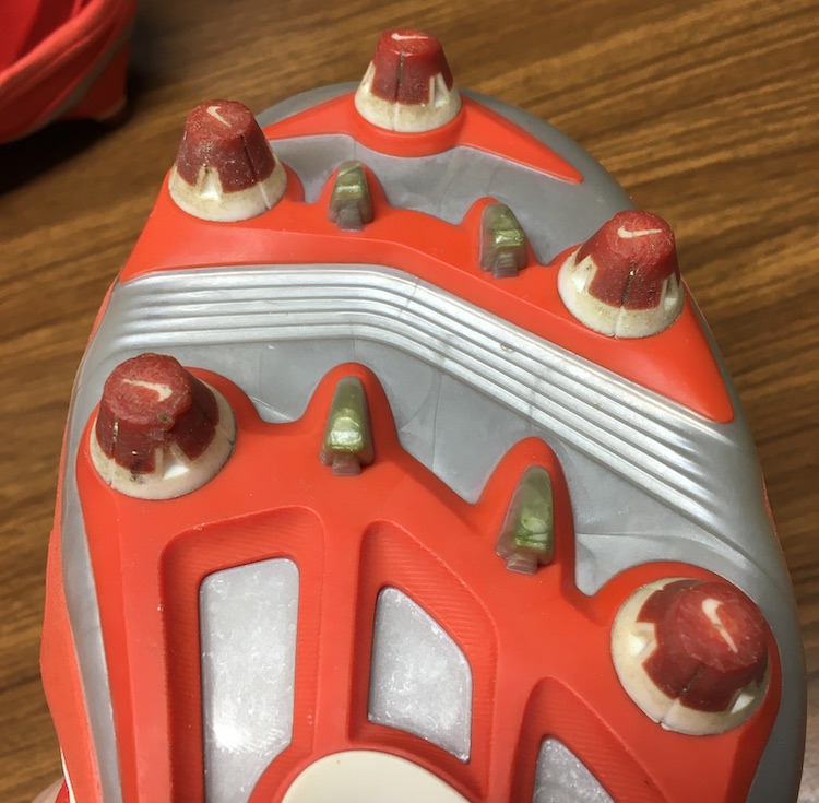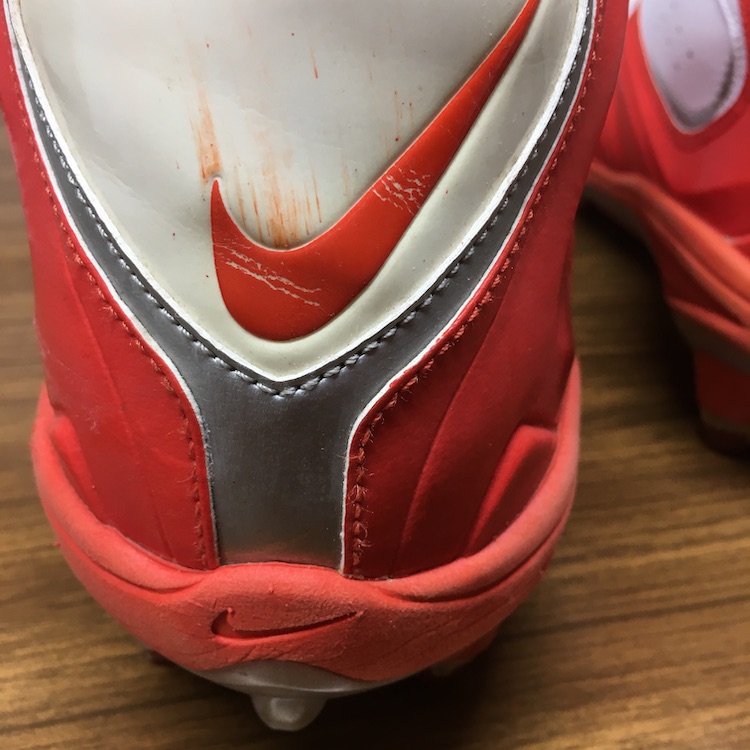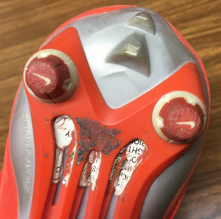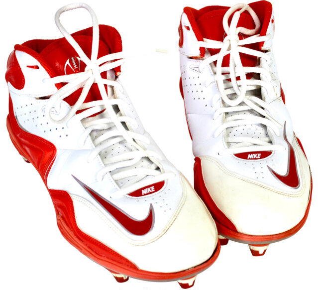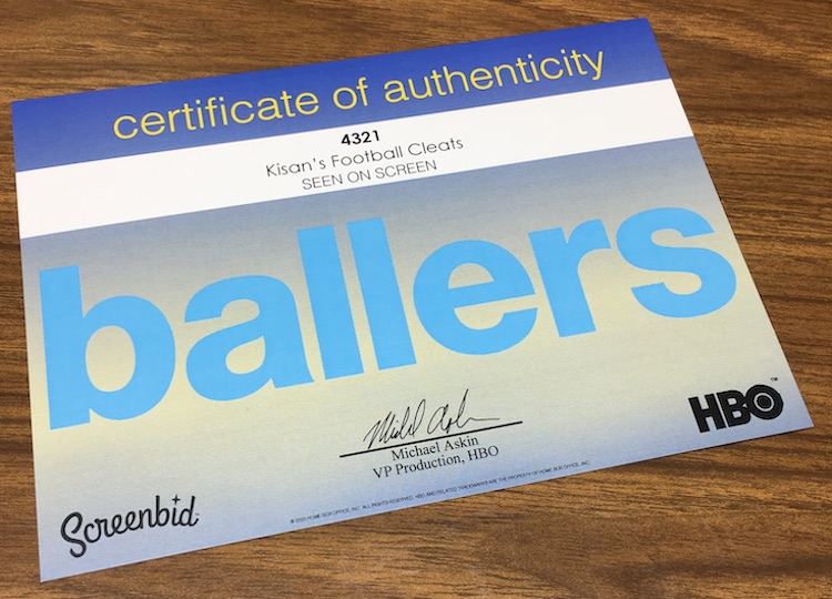 What's Buzz-worthy: These size-12 orange and white Nike Zoom Merciless D cleats actually do show a decent amount of wear on the cleat tips, scuffing on parts of the outsoles and sides, wear and turf still inside them as well as some minor staining and even some splitting of the seams -- clearly some use during filming. They were billed in the Ballers auction as being "training-used" by Kisan Teague as he joined the Miami Dolphins in Season 3. I'll confess to having not watched every episode of the hit series but when I checked out the specific episode? Well, I saw nothing ... but I did see a model of cleats identical to these in a front office display case for a moment in one scene. Could these be those cleats? I'll never know -- but I would think that those in the display case for dressing on a set might have survived a little longer than those of uniformed actors out on location. (Maybe.) Or, perhaps they're in a different episode before ... no spoilers. Now, this mystery isn't a big deal -- I won these on just a $2 bid early on to assure that I landed something from the auction to talk about here. I missed on a number of nicer obviously screen-used pieces that were sold for a ton more -- and could easily be photo-matched -- but later landed the book with a good story I mentioned before. Ironically, after fees and shipping these definitely weren't just $2 but I can now say I have my first (and likely last) used cleats in my memorabilia stash.