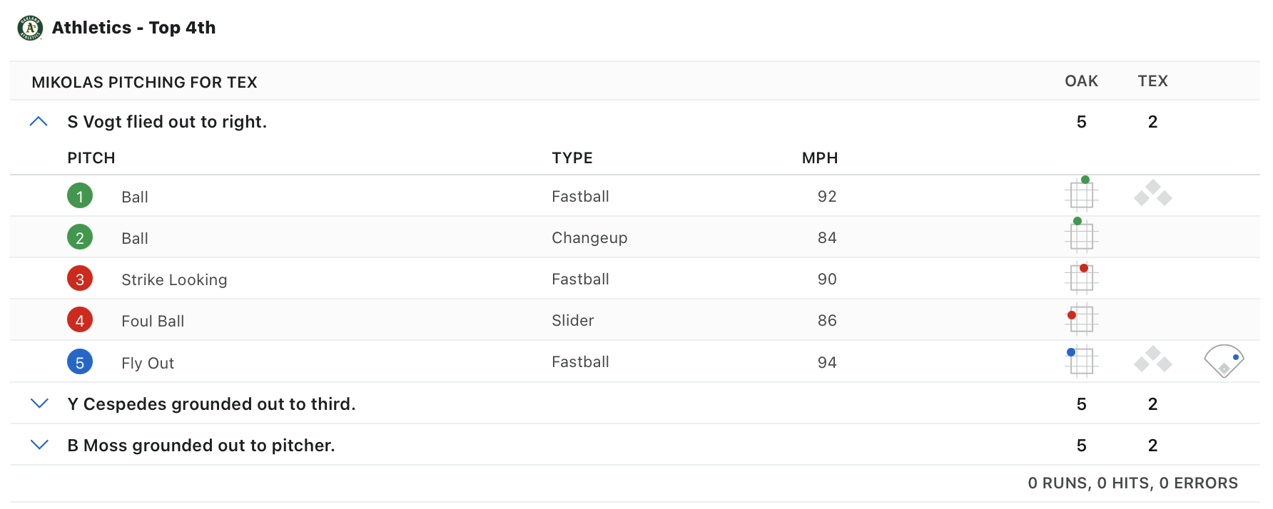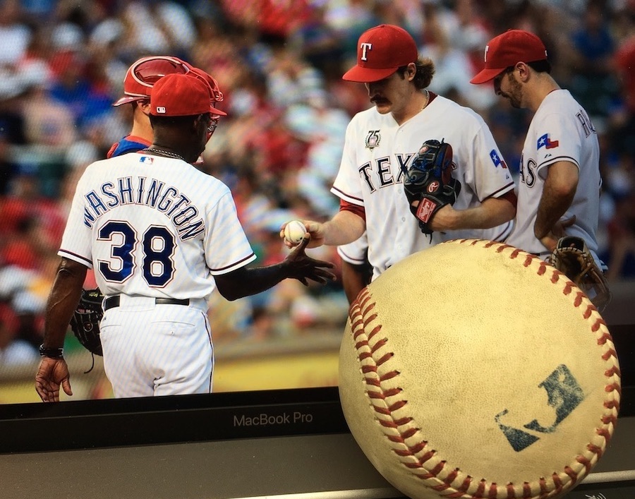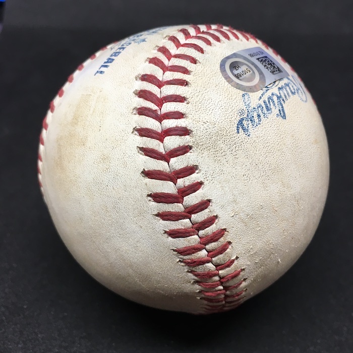 What's Buzz-worthy: This was Mikolas' fifth career start with the Rangers -- and only the fifth start of his career though he had pitched in 27 previous games for the Padres in 2012 and 2013 -- and the end result this time was his third loss of the year (fourth of his career). Mikolas allowed eight runs and walked four while striking out just one in four-plus innings. The photo up top (via Getty Images' publicly available site, a great resource for game-used collectors) is from the fifth when he was pulled, while this ball was from the first at-bat of a perfect fourth inning from the right-hander. It's a pretty standard ball with some nice use to it -- I have seen cleaner ones for sure. Mikolas was an All-Star with the Cardinals in 2018, winning a league-high 18 games, while Vogt was in his third season as a big-leaguer and was an All-Star the two years after this. More trivia for this particular game? Adrian Beltre hit his 391st career home run in the eighth inning. All in all, this ball isn't as flashy as others where you can watch its life on the diamond from start to finish but this one ain't bad ... for a grab-bag find.