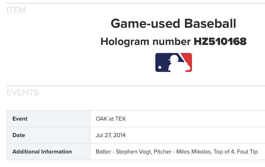 Game-used ball (MLB Authenticated): Oakland A's vs. Texas Rangers -- July 27, 2014 (A's won it, 9-3)