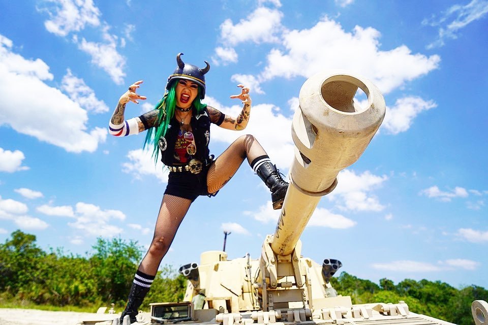 Her name, if you don't know it already from seeing the colorful hair and the horn-adorned Army helmet, is Shotzi Blackheart and she's a star I collect rather seriously in the traditional realms involving Panini America and Topps cardboard, so you'll know her name from reading many other items here. This is the first of a few entries in this series that will step away from the field and get in the world that includes a ring. If her look doesn't grab your attention, her unusual entrances at times might ... she originally rode to the ring in an intentionally absurd childrens' toy tank bought at a Walmart that just works with the vibes and the unusual energy of a Blackheart. (Yes, that name an homage to Joan Jett's punk band.) Meanwhile, in more recent days, her ride is more of a WWE-style tank with and her gear a more glamorized leather aesthetic in the ring and beyond with an energy that's evolved since her late-2019 arrival.