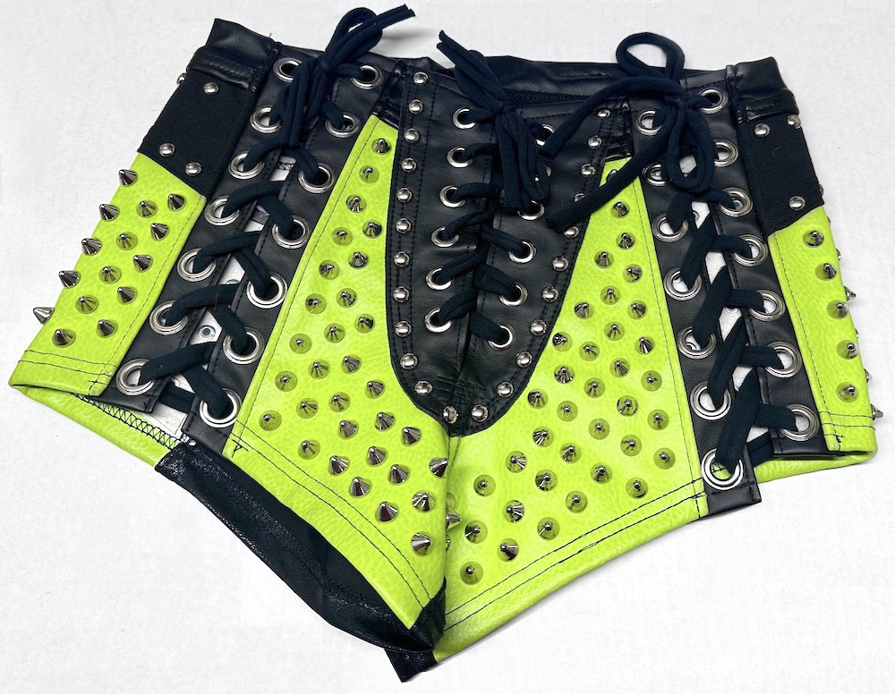 Worn wardrobe: Shotzi Blackheart custom-made green and black Wicked Lester spiked shorts