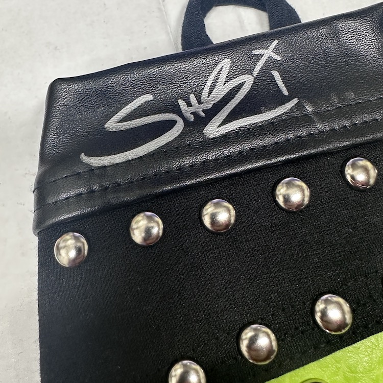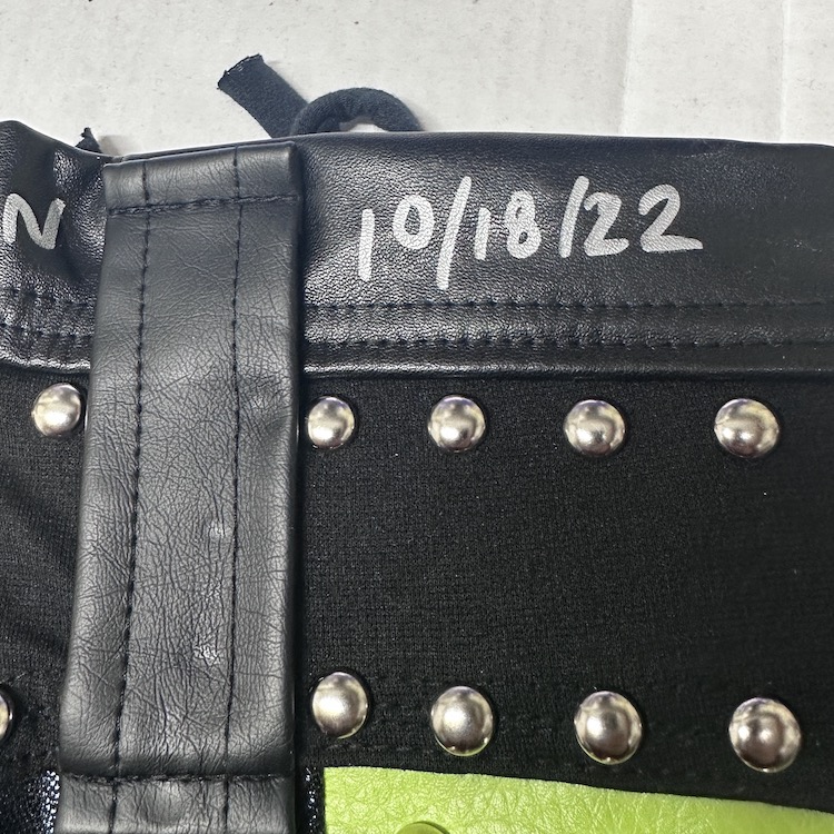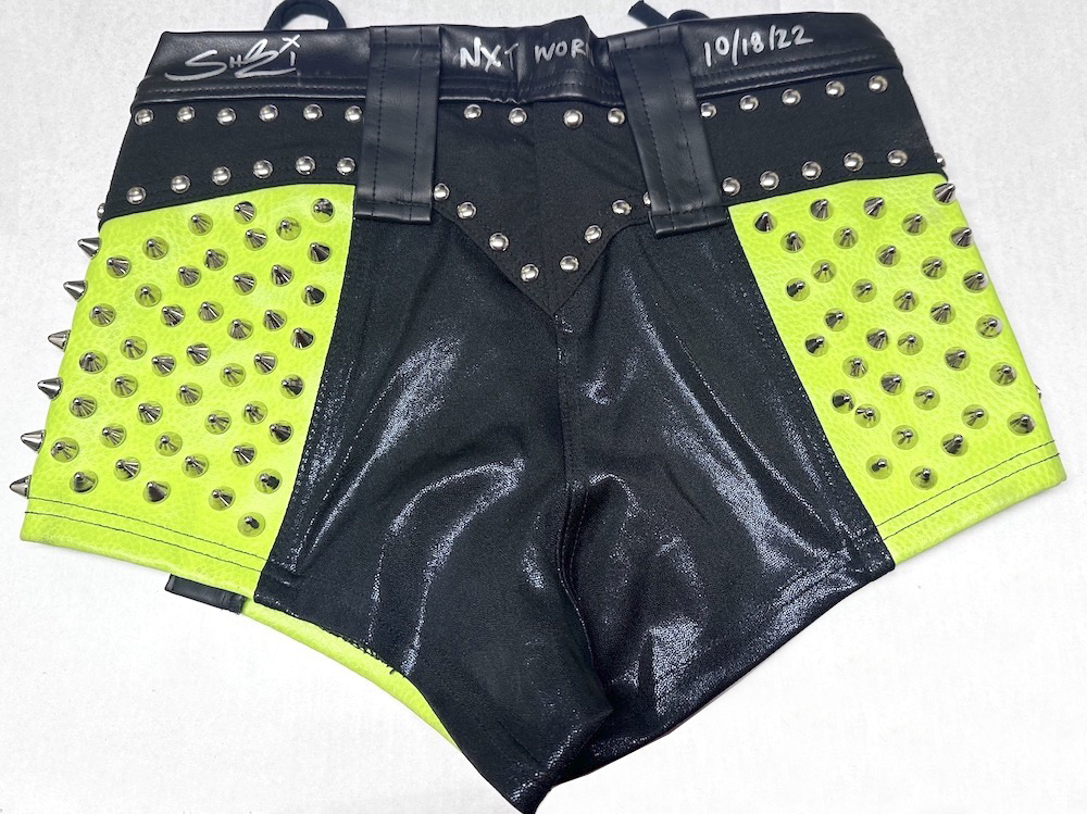 What's Buzz-worthy: There was no mystery with this one, unlike last time, as the WWE's Tank Girl had a photo of her with NXT enigma Quincy Elliott in this gear -- and that was enough for me to easily track down the when and where for this piece and have her add that info with her autograph on the back belt area, which just makes this photo-matched piece even cooler. (See that in the gallery below.) It wasn't a cheap addition, but it was a lot less than a new hobby box of Topps Chrome WWE cards, so I went there as a sure thing for my collection -- and this is my third of five pick-ups for this series. Ultimately, a goal would be to land something match-used from each of her styles/times in WWE that all have varying looks but right now any match-used stuff is still on my radar to a degree since that kind of stuff is more pricey. ... This Wicked Lester custom-made piece comes from not long after she was called up to the Smackdown roster -- gear like this being a sign of that as it's pricier vs. a lot of her previous appearance gear -- and when she revisited NXT in advance of its Halloween show. Why? She's one of the WWE's resident horror movie fans who gets into the season. She's donned many a movie-tied costumes during those shows, including Pinhead from Hellraiser, Tiffany from the Chucky series, Edward Scissorhands, The Joker, Beetlejuice and more for segments. This promo helped set her up as the host of the Halloween Havoc NXT event and her co-host was determined in a match that followed this. ... An extra fun nugget here? If you watch the start of that entrance closely, you can see photographers positioned near the ring for the video and a still photo shared from that quick entrance driving her original TCB Tank (that's Taking Care of Business a la Elvis Presley) that was shared on WWE social channels (also in the gallery) also appears on her 2023 Panini Prizm trading card. You can't really see the green on these spiked shorts, but they're there. It's also all those spikes that made this particular set not one that could be used during a match -- just like last month's item. But, without question, these were worn in the middle of a WWE ring so I'm one step closer.