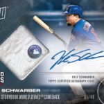 - ON-CARD AUTO RELIC # TO 49 – KYLE SCHWARBER COMEBACK JOURNEY HELPS CUBS TIE WORLD SERIES – TOPPS NOW $249.99