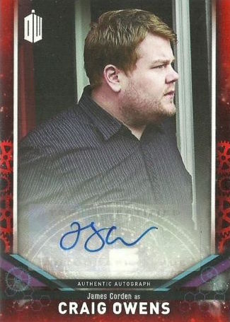 There are a number of guest stars who you might know if you're not a regular viewer of the BBC series and we'll use Carpool Karaoke icon and The Late Late Show host James Corden as an example of what's in this one. He appears on a pair of standard cards showing him as Craig Owens in his Doctor Who appearances and each card has a Red (/10), Blue (/25) and Green (/50) version. The standard cards are not numbered.