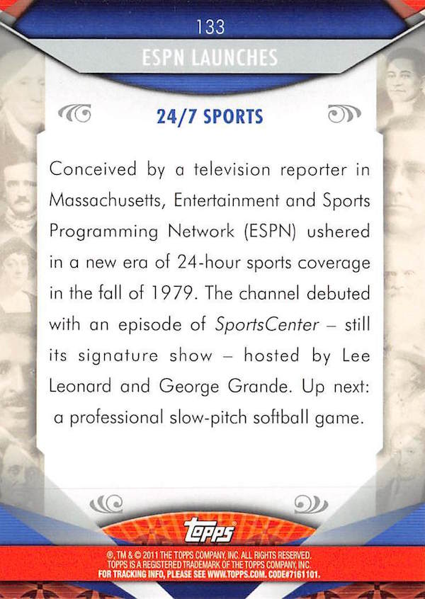 It's card No. 133 in the 2011 Topps American Pie set that highlights the arrival of the network as a notable and memorable event in American history alongside the important and the influential. It's a set that notes the arrivals of the bikini and Sports Illustrated. It's a set that notes Sesame Street and The Price Is Right. It's a set that notes "I am not a crook" and the Rubik's Cube just as much as it notes the deaths of Steve Jobs, Osama Bin Laden and Michael Jackson. It's got Kurt Cobain and it's got Kanye West interrupting Taylor Swift, too.