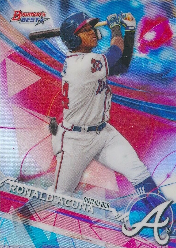 Big, big money is being thrown at Ronald Acuña Jr. first Bowman Chrome cards and his Rookie Cards the following year but in between there are a number of cards from prospect releases that aren't any less important for the most part yet can be light years away price-wise. Why is this? People latch onto the "big" stuff and those cards get flipped around a little more often as the prices rise. The other stuff can be a lot cheaper -- and if a guy truly blows up (like this guy did upon arrival) there might be more percentage gains for cards like these once people get priced out on the big stuff. This one isn't that cheap for rarer parallel versions but it is cheaper than others -- and there are a number of Bowman tweener years and cards for a lot of guys you can load up on without breaking the bank.