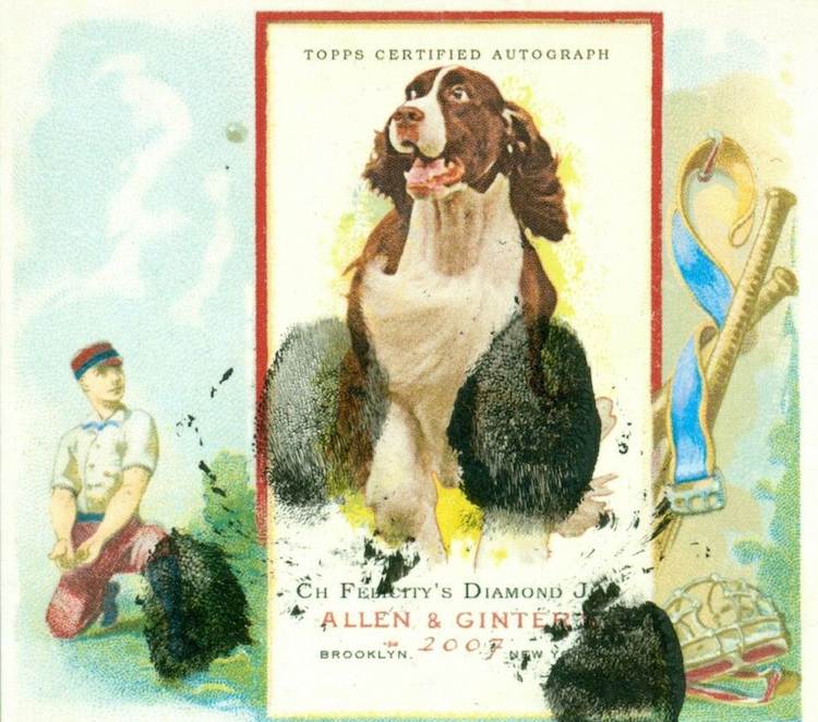 Hits are all over the place these days but sometimes they aren't like others and that was the case for this one -- a 2007 Topps Allen & Ginter "Pawtograph" from Ch. Felicity’s Diamond Jim, an English Springer Spaniel who won Best in Show honors at the 2007 Westminster Dog Show. Just 50 copies were signed here -- that is the dog's actual paw print -- for the winner who died in 2011 and worked as a therapy dog after the big win. This is more of a unique type of card more than a gimmick but there are many cards from the past -- not always pricey -- that can be memorable and, in turn, more valuable than you might think. This one is both -- check out its price on eBay.