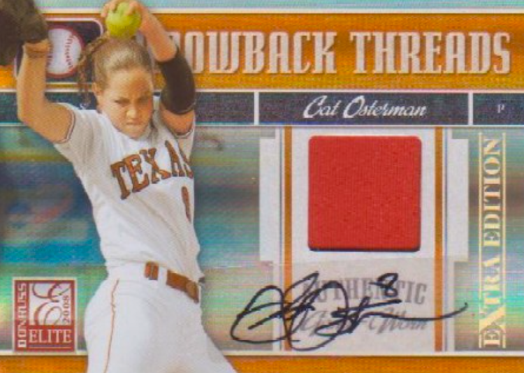 Whether it's a standard card, an autographed card or a memorabilia card, there's always some artistic flourish that can add to the appeal of a card. Some people love the shine of Refractor stock or foilboard like this 2008 Donruss Elite Extra Edition insert from the past. There are a lot of strong designs from the past that help fuel the interest in cards -- it's probably just something people don't think about first -- and this one is a perfect card in my mind not so much because I like this design but because all of the elements are balanced perfectly for this card of former Texas Longhorns softball star Cat Osterman who was included alongside MLB prospects and others in this release. Why? Card companies were exploring a lot of unusual inclusions in sets at that time and it was an Olympic year, too. Just 50 copies of this signed card were made and just 100 unsigned. The rarest version is a prime auto (/5) that carries the same solid design but with a better swatch.