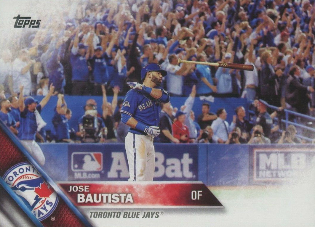Not all photos are the same -- compare the portrait to this one -- so then another logical step as to why a card might appeal is this ... a moment. Topps Now cards are all about moments -- daily -- but they don't often have the perfect photo. When you get a perfect photo and a moment there? Well, those are cards you'd perhaps want right now. This 2016 Topps Jose Bautista base card isn't a perfect photo (or design, really ... this one hasn't aged well to me) but it is the perfect moment without a crop that hurts the obvious. (This same image has been seen elsewhere -- cropped -- and it's just not the same.) This card sold as a PSA 10 on eBay for $20 and the only active one on eBay has an even higher price -- and part of that is the grade but the biggest reason anybody would want it? It has to be the moment. Bautista has plenty of cardboard and other Blue Jays cards that won't sell for that.
