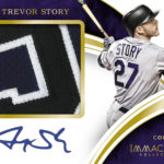 Panini promises "more jumbo premium hits than ever before" with a lineup that  includes jerseys, cleats, hats and gloves (batting and fielding). ... The rookie lineup here will include Trevor Story, Corey Seager, Nomar Mazara, Kenta Maeda, Kyle Schwarber, Miguel Sano, Stephen Piscotty, Blake Snell, Aaron Blair, Tyler Naquin, Michael Conforto and Trea Turner to name a few. RPAs will be limited to only 99 serial-numbered copies with three parallels that are limited to no more than 49 copies. ... Rookie premium patches will have larger swatches. Meanwhile, Jumbo Nameplate, Jumbo Cleat, Hat and Jumbo Batting Glove cards will be found as well as other pieces in Immaculately large fashion. ... Much like last year, there will be Immaculate Ink cards with trapped autos on black Tweedweave slips in gold ink, while Dual Diamond Inscriptions will be on-card. ... Also new this time are Immaculate Cleats with a piece of the sole from the player's cleat that are limited to 10 copies. ... The final card in each box will be a base card or a parallel. ... These boxes will carry a suggested retail price of $250.