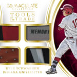 The Basics: The mix of cards here will include Tools of the Trade cards with multiple items inside each card and prime versions limited to only 10 copies. There will be on-card autos in the Rookie Autographs and Premium Patches Autographs sets. ... There will be Sports Variations autos where there will be big names from other sports who also played college baseball. These will be limited to no more than 99 copies. ... For other inserts there will be Immaculate Numbers that focus on uniform numbers and memorabilia, while Rookie Photo Shoot Rookie Player Caps cards will slice headwear into creative cardboard. There will be button versions limited to no more than 10 copies. ... This product is also exclusively tied to the Cyber Monday promotion for the hobby with each case ordered netting participating promotion dealers 36 packs. ... These boxes will carry a suggested retail price of $400.