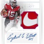 The Basics: New for this one on the memorabilia side are Team Logo Shield Signatures, Brand Logo Signatures and combo Team Logo and Team Slogan booklet cards. ... The base set will have jewel parallels this time with ruby, sapphire and emerald cards limited to no more than 20 copies. The diamond parallels will be 1/1s. ... Among the hits are Material Signatures that will have autos and mem from top rookies with logo versions limited to only two copies. ... On-card autos will be found for Material Signatures, Colossal Signatures and Signature Diecuts. ... Rookie Silhouettes also will be found here with prime versions limited to no more than 25 copies. ... Also to be found will be team logos autos for past and present players. ... Game-used college memorabilia will be found in this one for Aaron Rodgers, Adrian Peterson, Amari Cooper, Andrew Luck, Andy Dalton, Bobby Layne, Carson Palmer, Champ Bailey, Dan Marino, Elroy “Crazy Legs” Hirsch, Eric Dickerson, John Elway, Jim Thorpe, Le’Veon Bell, Marcus Allen, Marcus Mariota, Rob Gronkowski and Troy Aikman to name a few. ... Also in the mix will be Notable Nicknames autos limited to no more than 25 copies and Team Quads with four stars from the same schools. ... Booklets will showcase laundry tags, team logos, brands, team logos and team slogans. ... Boxes carry a suggested retail price of $500.