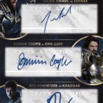 The Basics: The basic set will consist of 100 cards and 80 inserts -- a mix of character cards concept art and other inserts. Look for Blue, Red, Light Blue (/10) and Gold (1/1) parallels. ... Among the inserts will be Races & Creatures, Groups & Clans, Weapons, One-on-one Combat, Battle and Magic of Azeroth cards that all help tell the story of the game/film. ... Among the hits will be faction flag patches, autographs, Relics and sketch cards. ... Autographs will have duals, triples and printing plates. ... Relics will utilize props and costumes from the film. ... Hobby packs will carry a suggested retail price of $3.99, while boxes will have an SRP of $95.99. ... A preliminary checklist of autograph subjects and specific cards was not released.