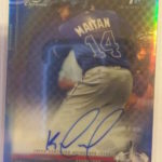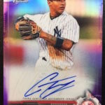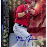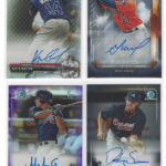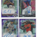 For Chrome prospect autos, the rainbow will include standard, Purple, Blue, Gold, Red (/5), Supers (1/1), Shimmers and 1/1 printing plates. Each will be numbered and only be found in hobby boxes. Chrome rookies will have a smaller rainbow with all of them numbered -- standard, Blue, Gold, Red (/5) and 1/1 Supers along with plates.
