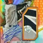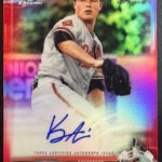 The Basics: HTA Choice boxes will include only three cards -- all autos -- with their own exclusive parallels. Prospect autos found only here will include Gold Shimmer (/50), Orange Wave (/25) and Black Limited Edition (1/1). The prospect Refractor auto rainbow beyond these exclusives and also found elsewhere will include standard, Blue (/TBD), Green (/TBD), Gold (/TBD), Red (/5) and 1/1 Superfractors. Orange Refractors will only be had in hobby boxes and will be limited to 25.