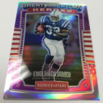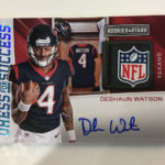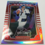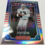 The Basics: This one returns with "an extremely limited case run" with an average of 22 insert cards per box with some of those including Airborne, Rookie Rush, Prowlers and Precision Passers along with Crusades, Great American Heroes and Stellar Rookies. There will be five numbered cards per box with some of those printed on Prizm stock. There will be Gold Prizm parallels (/10) only in hobby packs along with Black & Blue (/5) and Red & Blue (/25) parallels. ... Among the hits will be Dress for Success autos, Rookies Longevity Signatures, Prime Cuts memorabilia, NFL Authentic, Year One, Great American Signatures and Great American Treasures. ... Packs will include 10 cards and carry a suggested retail price of $100 per box.