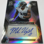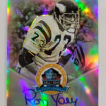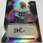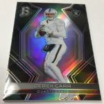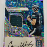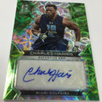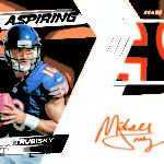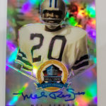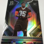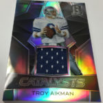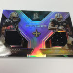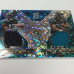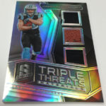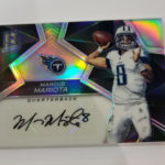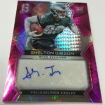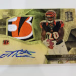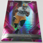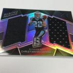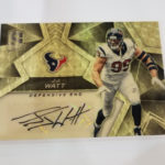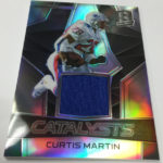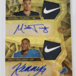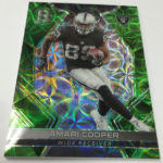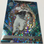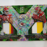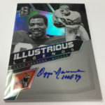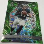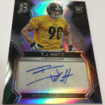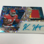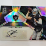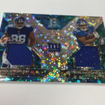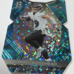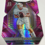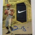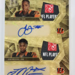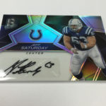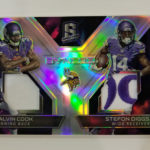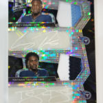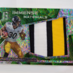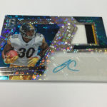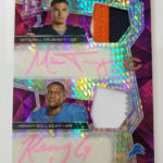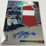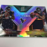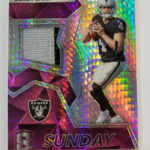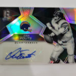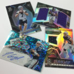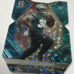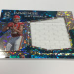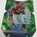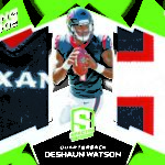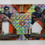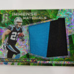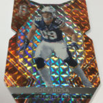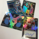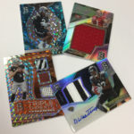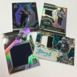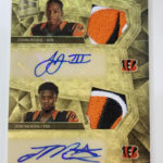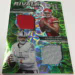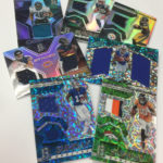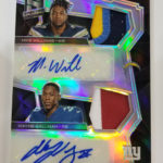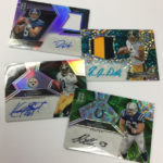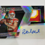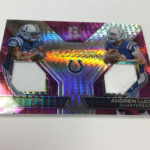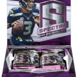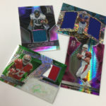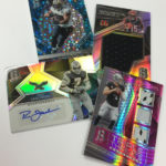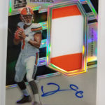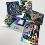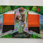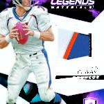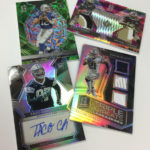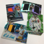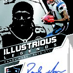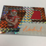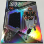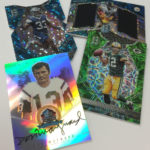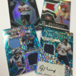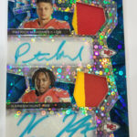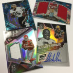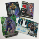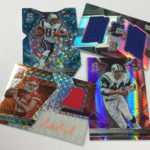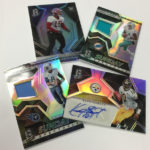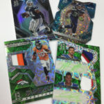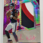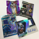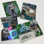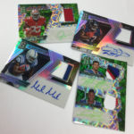 The Basics: There will be at least three Prizm cards per box in these, which will include four cards per pack. ... Rookie patch autos will be limited to only 99 copies, while duals will be limited to 25. Among the many parallels will be Neon Orange, Gold and Neon Green. ... Among the autos will be Aspiring Patch Autos, Radiant Rookie Patch Signatures as well as laundry tags, Nike logos, team logos and NFL shields for the rookie patches. ... There will be on-card autos from NFL greats in the Illustrious Legends set, while this one also will include Neon Black Light autos and new Nebula parallels along with Triple Threats Materials. Other cards in this one will include Attired Athletes, Epic Legends, Rising Rookies and Catalysts. ... Packs carry a suggested retail price of $75 apiece.
