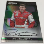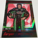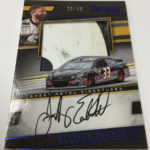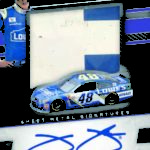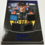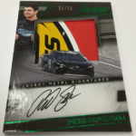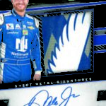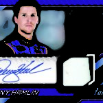 The Basics: In addition to the hits, there will be five parallels, four inserts and one Clear Vision card in every 50-card box. ... Autographs will be on-card and memorabilia cards will often be multi-swatch creations. Among the signed hits will be Jumbo Firesuit Signatures, Silhouettes Sheet Metal Signatures, Silhouettes Firesuit Signatures and Combo Materials Signatures. Each of these will have a Blue (/99), Red (/49), Green (/25) and Purple (/10) parallel. Cards may be lower than those numbers -- that's a max. ... Memorabilia cards will include Prime Associate Sponsor patches, Quad Materials, Metal Materials, Paired Materials and Raced Relics. Each also will have the same rainbow of parallels. ... Packs carry a suggested retail price of $30 or $150 per box and each half-case inner guarantees an autograph from a top-five driver.