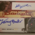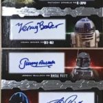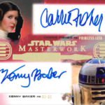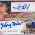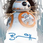 The Basics: Each box will include four five-card packs (a mini box) with three base cards, one parallel and one hit -- a mix of autographs, film strip cards, animation cels, droid medallion cards and sketches. ... For the base cards, it's a larger 100-card set this time with short-prints to be found and 72-point stock used. Parallels will be found with Blue (two per box), Green (/99), Purple (/50), Gold (/25) and 1/1 Red and printing plates. There also will be 25 short-printed character cards. Adding to the chase are three insert sets -- Hall of Heroes, Adventures of R2-D2 and Evolution of the Rebel Alliance. These will have Rainbow Foil, Canvas, Wood, Metal, Gold-tinted Metal and printing plate parallels. ... More than 40 signers will be found in this one from throughout the franchise's universe with a number of parallels -- Rainbow (/50), Canvas (/25), Wood (/10), Silver Framed (/10 or less) and 1/1 Gold Framed. There also will be autographed pen Relics using tips of pens used to sign the cards. ... There will be double and triple auto cards along with quad booklets, parallels of sketch cards and more. ... Animation cel cards will be found for Star Wars: Droids and Star Wars: Ewoks.