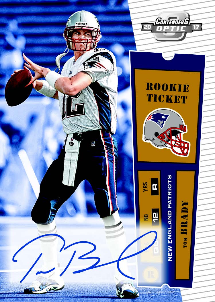 The Basics: A typical box will include one on-card auto, one sticker auto, two base cards, one parallel and one insert. ... There will be Contenders Tribute auto sets for 1999 and 2002-2005 and a 2000 Contenders Tribute auto for Tom Brady -- the 2000s will be limited to three copies along with a 1/1 Gold Vinyl parallel. The 2004 cards will be limited t0 10 copies with a 1/1 parallel. ... The Season Tickets will have Red (/199), Blue (/99), Orange (/49), Gold (/10) and 1/1 Gold Vinyl parallels while Rookie Ticket autos will have Red, Purple (/99), Orange, Blue (/25), Gold and Gold Vinyl versions. ... Other autos will include All-Time Contenders with Blue (/25), Gold (/10) and 1/1 Gold Vinyl versions and the Player of the Year Contenders will have the same lineup. Veteran Ticket autos (/25) will include Gold Vinyls to chase. ... Among standard inserts will be Xs and Os and Triple Threat (both /175). They'll both have Purple (/99), Orange (/49), Blue (/25), Gold (/10) and 1/1 Vinyl versions. ... Boxes carry a suggested retail price of $100.