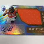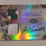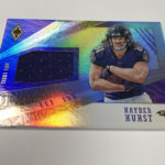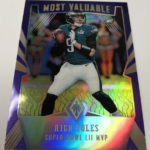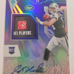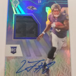 The Basics: There once again will be 12 parallel cards, nine inserts and 12 rookies in every box atop the hits. New this year will be Color Burst hot packs one per box with color variations of base cards, inserts and Rookie Cards. Those will include base (one in six packs), QB Vision (one in 40), Unmatched (one in 40), Adrenaline Rush (one in 60), Agility (one in 120) and Most Valuable (one in 120). ... Rookies will be found in three autographed memorabilia inserts -- rookie auto jerseys, rookie jumbo autos and Rising Rookie material signatures. There also will be prime versions of these and Rising Rookie cards with glove, helmet and football swatches. There also will be jumbo swatches for the rookies, jumbo memorabilia and veteran materials sets that will also have parallels and 1/1 super-prime cards. ... The base set will include 100 cards with veterans from all teams with Red (/299), Pink (/199), Purple (/149), Orange (/99), Yellow (/75), Green (/25), Black (/10) and 1/1 Blue parallels along with printing plates. Atop this, there will be 100 rookies with the same parallels. ... The rookie auto jerseys will be (/299 max) with Orange (/149 max), Yellow (/75 max), Green (/25 max) and 1/1 laundry tag, brand logo, NFL shield and Blue super prime versions. ... The jumbo rookie autos will be limited to 149 max with Orange (/99), Yellow (/75), Green (/25) and 1/1 laundry tags, brand logos, shields, and super prime versions. ... Rising Rookie memorabilia will be /299 with 1/1 versions with Swoosh, Vapor Jet, NFL shield and team logo swatches. ... Jumbo memorabilia cards will be /199 max with Purple (/75), Prime Yellow (/25), Prime Green (/10) and 1/1 Super Prime Blues. ... Other memorabilia cards will include triple patch autos and veteran materials (/199) with those having the same rainbow as the jumbos. ... These boxes carry a suggested retail price of $120 ($10 per pack).