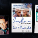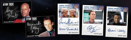 The Basics: Among the signers here will be regulars Avery Brooks, Michael Dorn, Terry Ferrell, Rene Auberjonois, Nana Visitor, Alexander Siddig, Armin Shimerman and Cirroc Lofton, while there will be dual-auto cards and then sigs from others that include Iggy Pop, Bill Mumy, Bernie Casey, Vanessa Williams, Steven Weber and Chase Masteron to name a few. ... Sketch cards will be found one per case, while there will be 100 metal parallel cards, 36 Rules of Acquisition cards, original art cards, Deep Space Nine Aliens cards, Ships of Line cards, DVD cover cards, Relationships, "Niners" baseball patch cards, Archive Cut Comic Cards, pin cards and a display relic. There will be two case-toppers -- heroes or villains -- while there will be six-case dual-auto incentive card with autos from Terry Farrell (Jadzia Dax) and Nana Visitor (Kira Nerys), while a nine-caseer will be an Avery Brooks auto and Archive Boxes will be 18-case bonuses that include seven extra autos and a printing plate set. Among those autos will be cards for a Mirror Universe Nana Visitor, an Iggy Pop and variation autos for Mumy, Felecia Bell, Chase Masterson, Deborah Lacey and Andrew Robinson. ... Boxes carry a suggested retail price of $99.99, while binders should be $24.99.