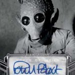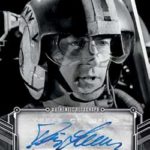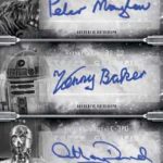The Basics: This hobby-only release will include a 150-card base set and four inserts along with the hits. The base set will have a number of parallels -- Sepia (above, one per pack), Blue (one per box), Green (/99), Purple (/25), Red (/10) and 1/1 Metal cards. ... The inserts will include Behind The Scenes, Concept Art, Iconic Characters and Posters. ... On the autograph front, there will be dual and triple autos in the mix along with a single six-person auto with some of the biggest names from the film -- Harrison Ford, Mark Hamill, Carrie Fisher, Kenny Baker, Peter Mayhew and Anthony Daniels. ... The standard autos will have four parallels -- Blue (/99), Green (/25), Purple (/10) and 1/1 Red.