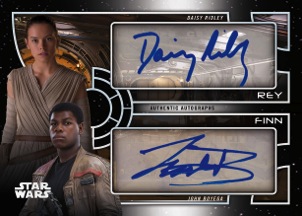 The Basics: The hits in this one will include autographs with duals, triples and even a six-piece card as well as movie poster patches, sketch cards and source material fabric swatch cards. ... The basic set will showcase 200 characters from the Star Wars galaxy with each having six parallels -- Blue, Green (/199), Purple (/99), Gold (/10), White (/5) and 1/1 Red cards. ... Insert sets will spotlight vehicles, famous quotes, weapons, locations, and galactic moments like last year but also with new Band of Heroes and Sinister Syndicates sets ... Autographs will have Green (/50), Purple (/25), Gold (/10), White (/5) and Red (1/1) parallels along with signed printing plates, while there will be multi-auto cards. ... Movie poster patches will have Blue (/99), Green (/50), Purple (/25), Gold (/10), White (/5) and 1/1 Red versions. ... Source material cards will also have parallels -- Purple (/25), Gold (/10), White (/5) and 1/1 Red versions.