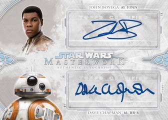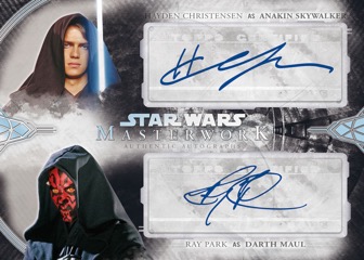 The Basics: Each box will include four five-card packs (a mini box) with two base cards, one parallel, one insert and one hit. ... For the base cards, it's once again 100-card set this time with short-prints to be found and 72-point stock used. Parallels will be found with Blue (one per pack), Green (/99), Purple (/50), Orange (/10), Black (/5) and 1/1 Gold as well as printing plates. There also will be 25 short-printed character cards just like last year. Adding to the chase are three insert sets -- History of the Jedi, Super Weapons, Powerful Partners. These will have Rainbow Foil (/299), Canvas (/25), Wood (/10), Metal (/5) and 1/1 Gold-tinted Metal and printing plate parallels. ... More than 40 signers will be found in this one from throughout the franchise's universe with a number of parallels -- Blue (/99), Rainbow (/50), Canvas (/25), Wood (/10), Silver Framed (/5) and 1/1 Gold Framed and printing plates. ... There will be double and triple auto cards in this one with Canvas (/25), Wood (/10), Black (/5) and 1/1 Gold versions, while there also will be Pen Relics once again as well as quad-auto books and heroes/villians auto books, too. Other hits here will include commemorative patch cards (with parallels), autographed patch cards, sketch cards and sketch card books.