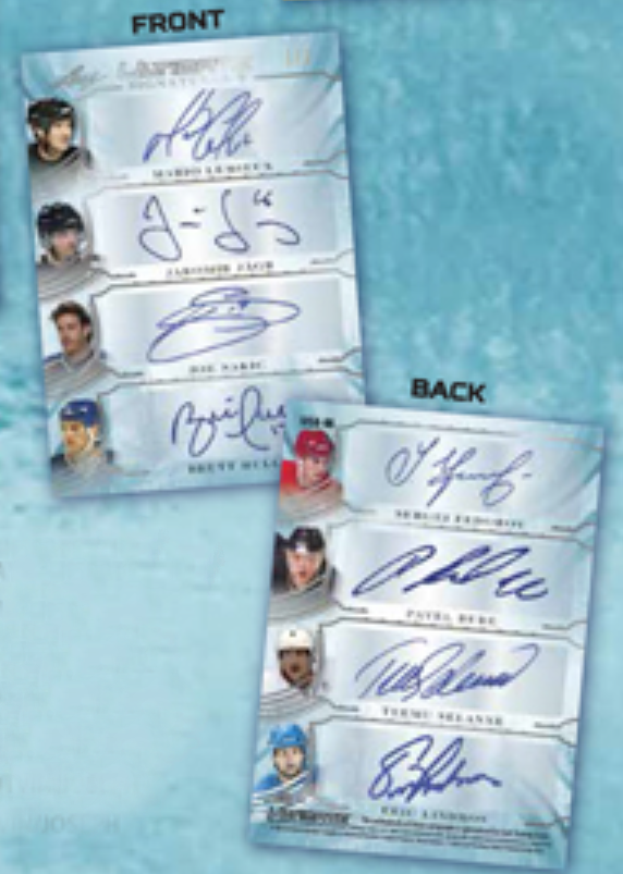 The Basics: Boxes will be loaded with cards from at least 15 different sets. That lineup will include Pioneers Four, Mount Rushmore, Numerology, Rare Materials Three, The Ultimate Card, Ultimate Auto Memorabilia, Ultimate Tribute Signatures, The Fabled Four, Ultimate Signature Relics, Ultimate Hockey Almanac, Ultimate Super Swatch Signatures, One-timer Memorabilia, One-timer Auto Shields, Ultimate Masked Men and Ultimate Signatures cards that can be found with one, two three, four, five or six autos. ... Among autographs teased for inclusion in this one are Gordie Howe, Jaromir Jagr, Maurice Richard, Mario Lemieux and Brett Hull among others.