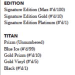 For the English Premier League, the basic Donruss design appears to get the ride here with 200 players from all 20 clubs and a full lineup of parallels (second row below). There also will be autographs with teased names including Christian Pulisic, Jamie Vardy, Marcus Rashford, Jordan Pickford, Toby Alderweireld, Dwight McNeil and Łukasz Fabiański. Its teased inclusions will be Titan inserts -- a first for Panini soccer -- while hits will include Silhouettes and Rise & Shine. Teased signers include James Maddison, Harry Kane, Anthony Martial, Olivier Giroud and Héctor Bellerín.