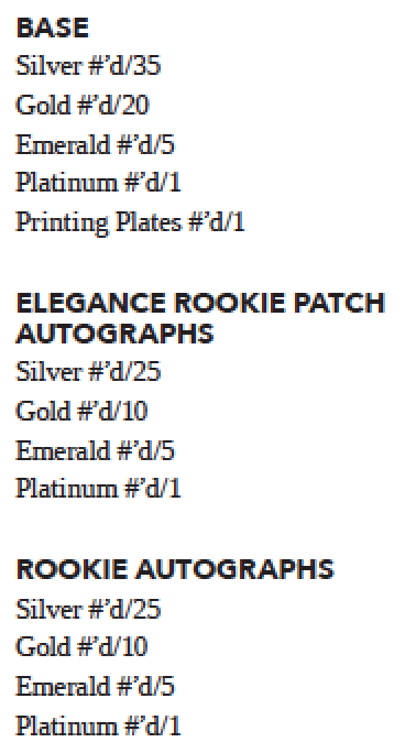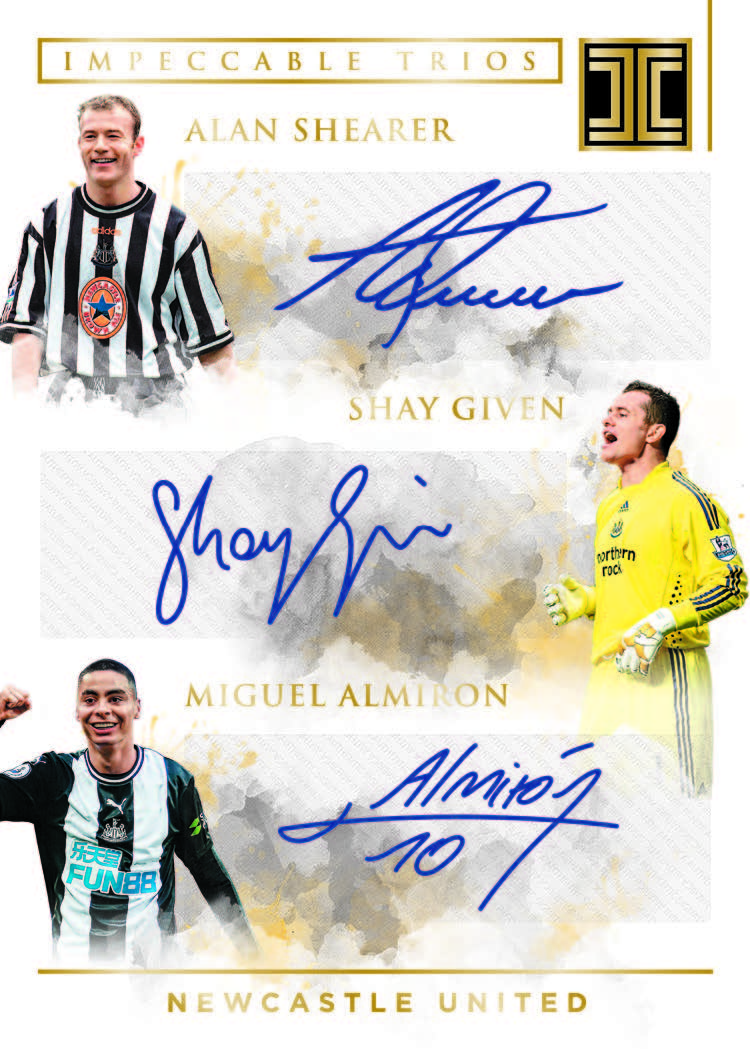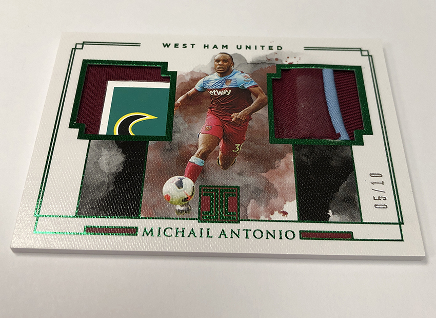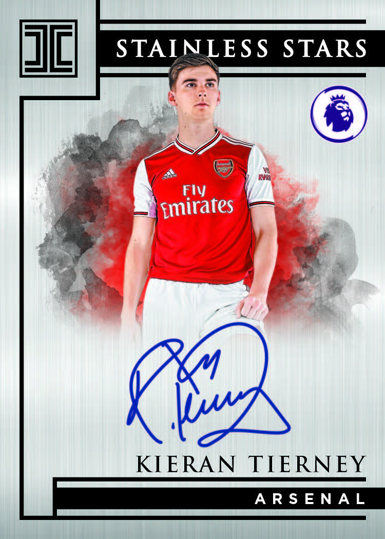 The Basics: Boxes of this one will include one base card from a 100-card set, one parallel card (details below) and one insert card atop of the hits with all 20 Premier League teams in play here and with past and present players also in the mix. There will be steel cards for the Stainless Stars and Rookie Metal inserts with autographs limited to just 25 copies. There also will be cards with a slab of silver or gold embedded into the card with the league's logo. ... Among the autographs will be Impeccable Jersey Numbers, Elegance Rookie Patches, Club History, Champions Signatures (/10), Rookie autos, Trio Signatures (/10) and All-time Legends. ... There also will be jumbo patch cards for memorabilia fans. ... Boxes will carry a suggested retail price of $500.