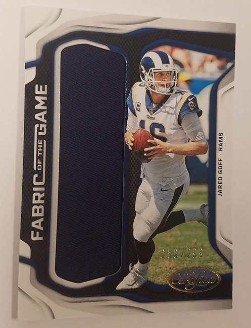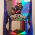 The Basics: There will be one Freshman Fabric Signature card per box along with one other auto and two memorabilia cards. A typical box also will include 10 inserts, two rookies or rookie parallels and then three other parallel cards. ... Base cards will have nine parallels this year -- Mirror (/450), Orange (/199), Red (/99), Blue (/50), Teal (/35; new), Gold (/25), Purple (/10), Green (/5) and 1/1 Black. Rookies will have the same parallels but with standard RCs (/399) and the standard Mirrors (/299) while the rest of the rainbow is the same. ... Freshman Fabric patch autos (last year's rookie on the mock in gallery) will have team logos, nameplates and 1/1 NFL shields in the mix and the parallels there will include Mirror (/499), Orange (/299), Red (/199), Blue (/99), Teal (/35), Gold (/25), Purple (/10), Green (/5) and 1/1 Black. ... Also in play will be Fabric of the Game Signatures (/199) with veterans in the mix as well as patch versions (/50) and 1/1 Super Prime cards. Joining those will be Established Autographs (/99) with Teal, Gold, Purple, Green and Black parallels (same volumes) as well as Etched Rookie Signatures (/25) also with Gold, Purple, Green and Black versions. ... Mirror Signatures autos (/99) will include 100 different signers with each of them having Red (/75 max), Blue (/50), Teal (/35), Gold (/25), Purple (/10), Green (/5) and 1/1 Black versions. Joining those will be Gold Team Etched Mirror Signatures (/10 max) with 1/1 Black versions. ... New Generation Jerseys will focus on newcomers with the standard versions not numbered but the rest of the parallels -- Orange, Red, Blue, Teal, Gold, Purple, Green, Black -- basically falling in line with a slightly higher volume than others. ... Boxes will once again carry a suggested retail price of $100.