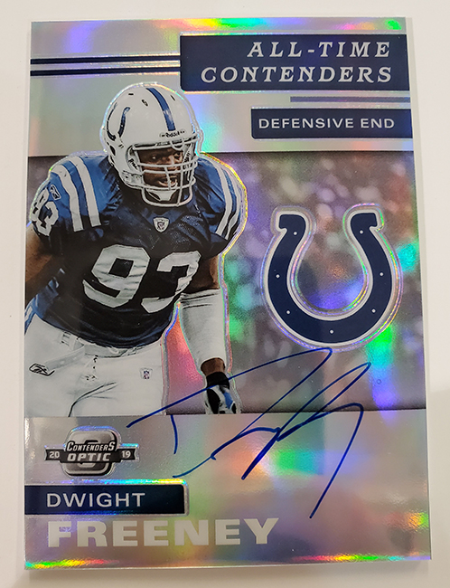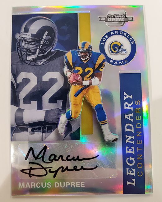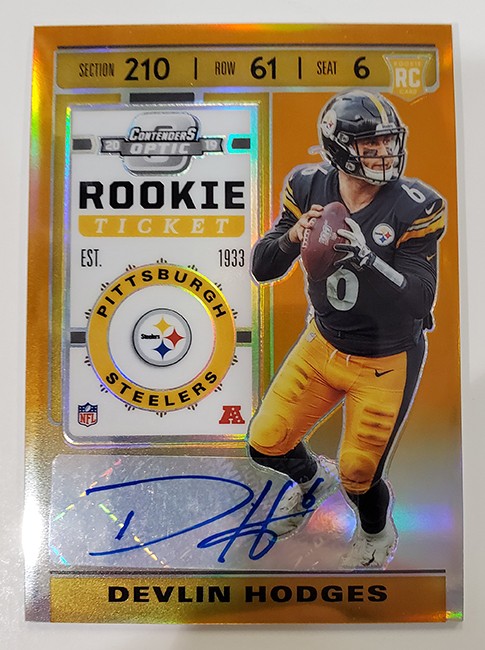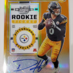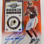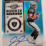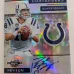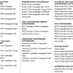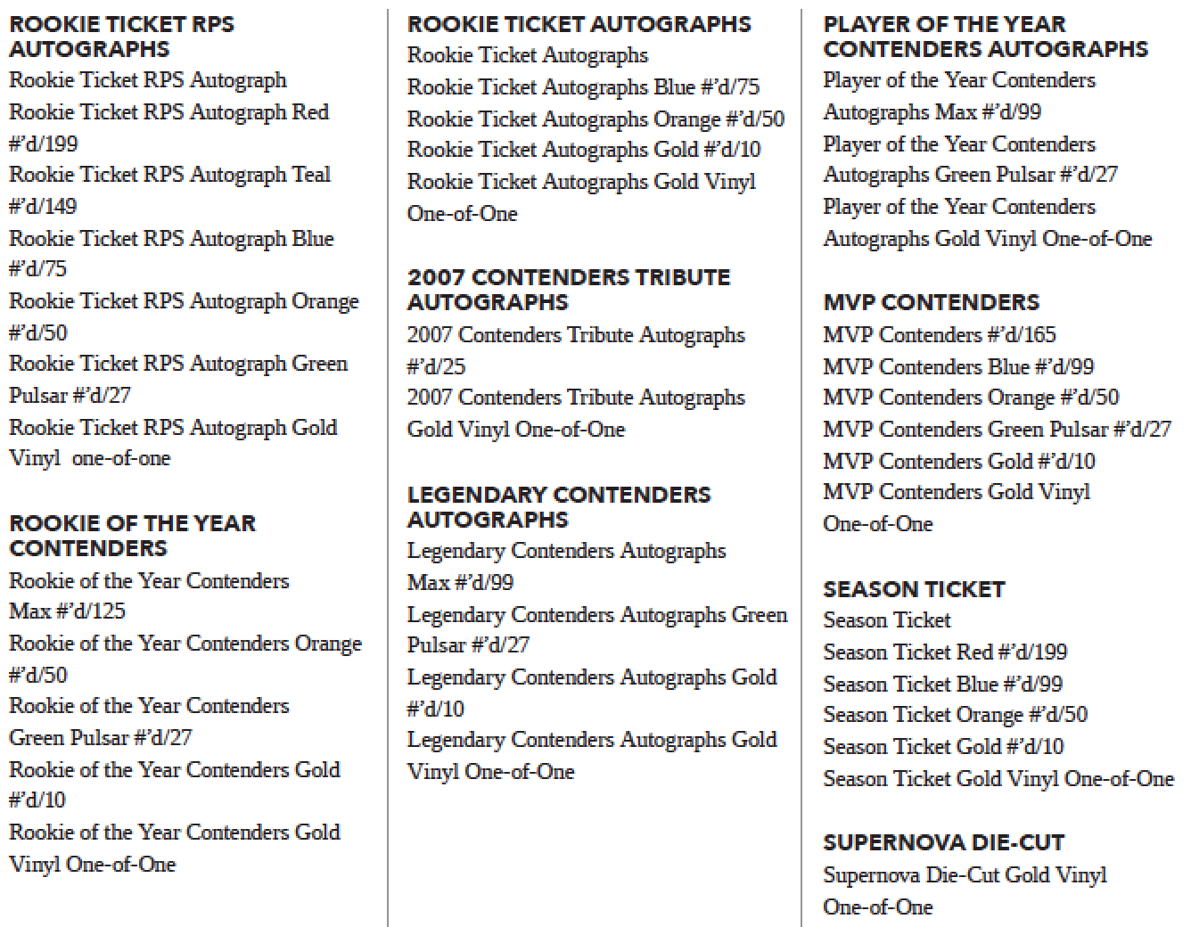 The Basics: A typical box will include one on-card auto, one sticker auto, two base cards (Season Tickets), one parallel (/199 max) and one insert. ... The lineup is relatively simple with plenty of parallels -- see the gallery below -- with Rookie Ticket autos, Rookie of the Year Contenders autos, Player of the Year Contenders autos and Legendary Contenders autos in play. Joining them are 2007 Contenders Tribute autos. ... On the insert card front, there are MVP Contenders and Supernova Diecuts as well as All-Time Contenders and Winning Tickets showcasing Super Bowl MVPs. ... Boxes carry a suggested retail price of $120.