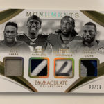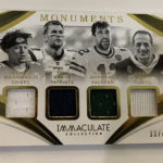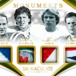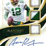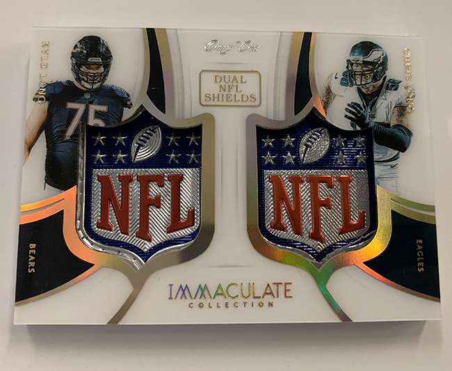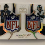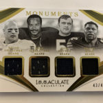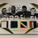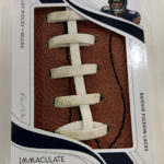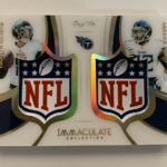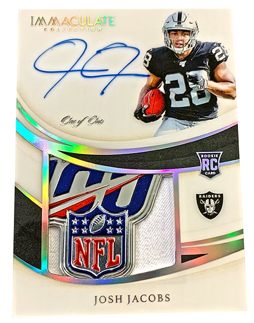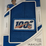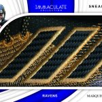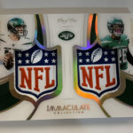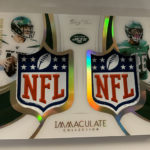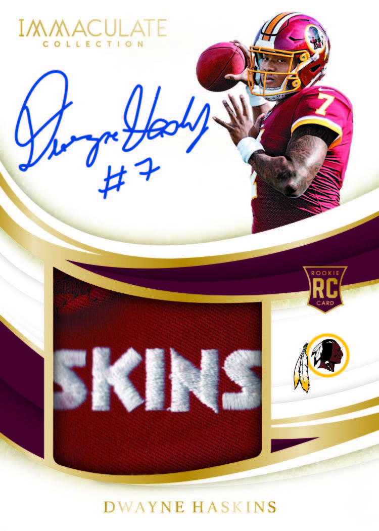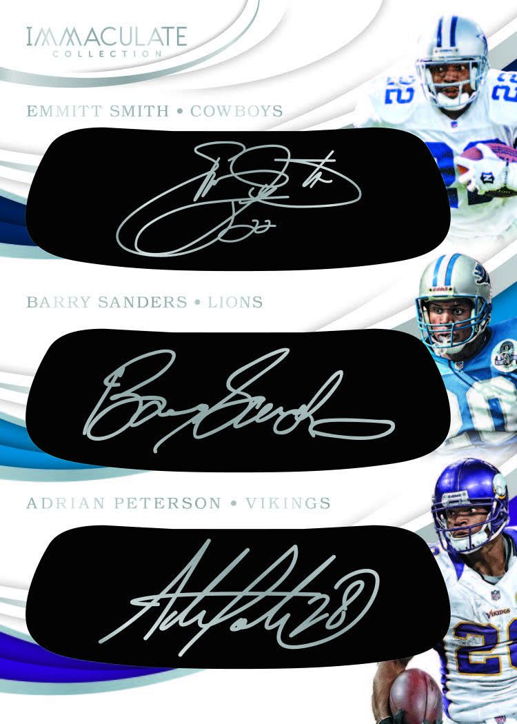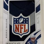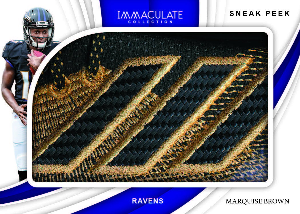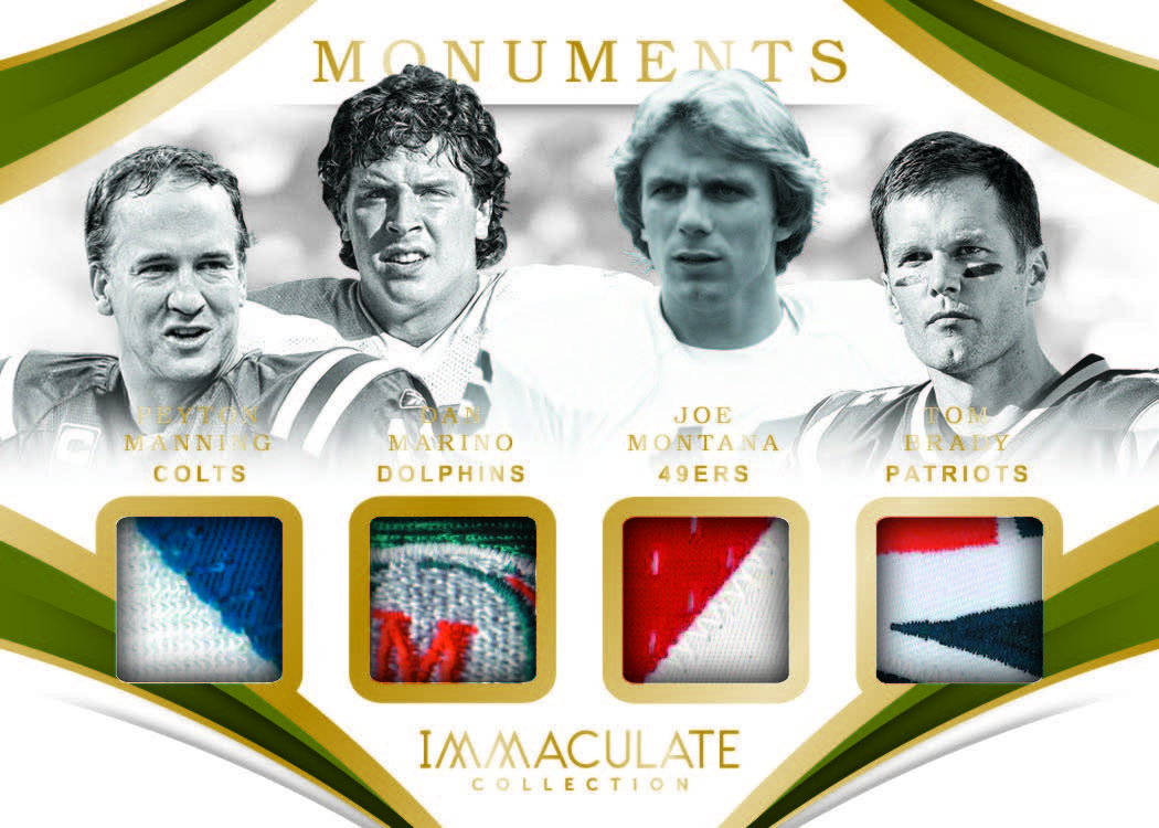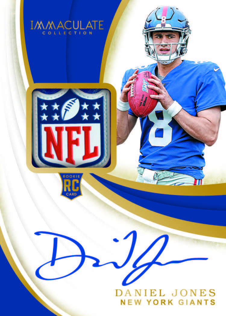 The Basics: Rookies will get their first on-card rookie patch autos in this one, according to Panini, with on-card ink to be found for the RPAs, premium patch rookies, Players Collection and Immaculate Number RPAs for starters. ... There will be a few on-card auto inserts this time around with Pro Bowl Signatures, Marks of Greatness and Draft Class Signatures, while eye black triple autos are also new inclusions. Among memorabilia cards will be the new Monuments cards (prime parallel /10) while jumbo mem cards will include team- and brand-logo cards as well as laundry tags and NFL shields for starters. ... RPAs (/99) will have parallels -- Gold (/25 max) and 1/1 Platinum tags and NFL shield cards. Premium patch rookie autographs will have the same parallels and volume, while only top players in NFL history are found in the Mark of Greatness set (/25 max). ... Joining those will be acetate autos in the Immaculate Player Collection set (/99) with parallels including Gold (/5) and 1/1 tags. ... Among the memorabilia options will be 1/1 dual NFL shields as well as Sneak Peek cards that are part of a jumbo-mem lineup that includes gloves, helmets, cleats and more with cards rarer than 25 copies apiece. New will be Rookie Reserve mem cards with five swatches per card (/25) with 1/1 cards for the brand logo and NFL shield versions. ... Boxes will once again carry a suggested retail price of $400.