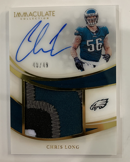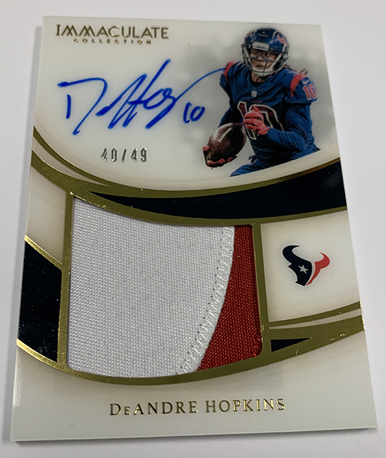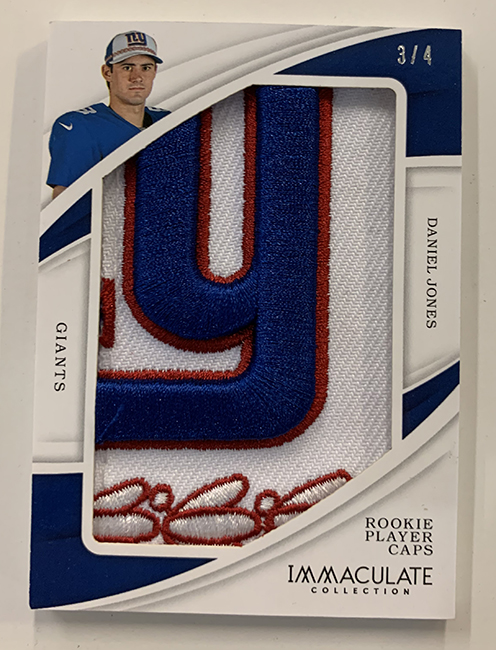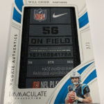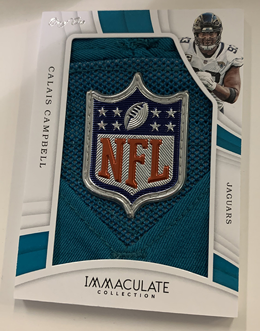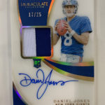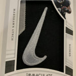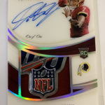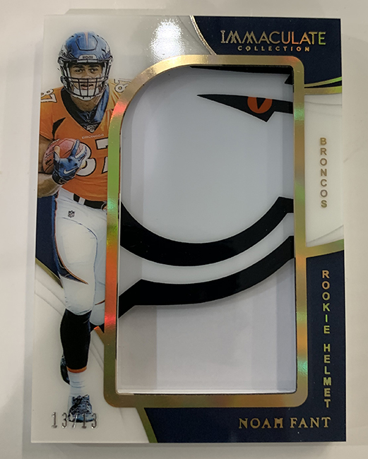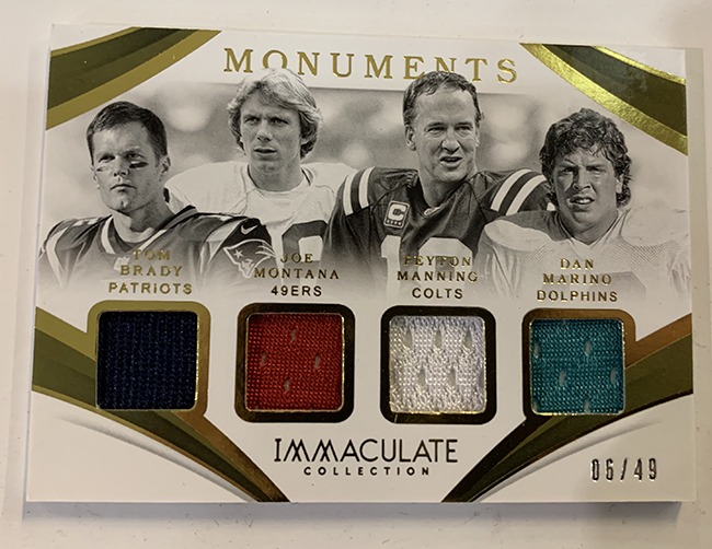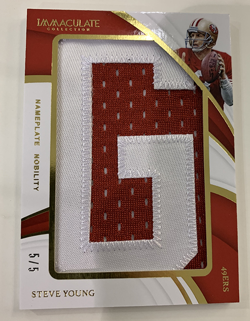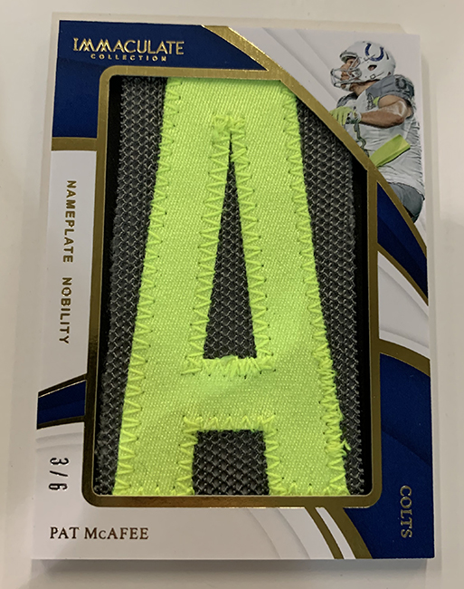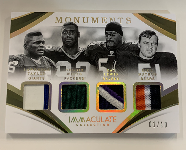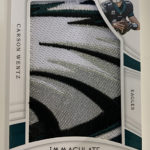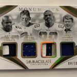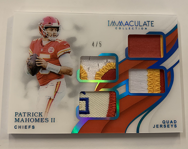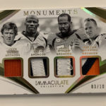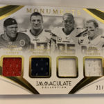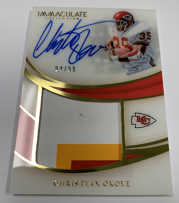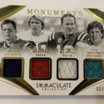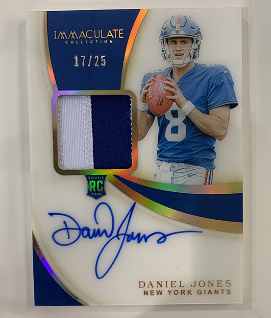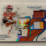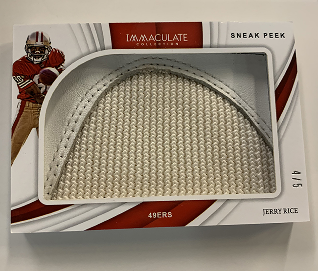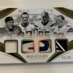 The Basics: Rookies will get their first on-card rookie patch autos in this one, according to Panini, with on-card ink to be found for the RPAs, premium patch rookies, Players Collection and Immaculate Number RPAs for starters. ... There will be a few on-card auto inserts this time around with Pro Bowl Signatures, Marks of Greatness and Draft Class Signatures, while eye black triple autos are also new inclusions. Among memorabilia cards will be the new Monuments cards (prime parallel /10) while jumbo mem cards will include team- and brand-logo cards as well as laundry tags and NFL shields for starters. ... RPAs (/99) will have parallels -- Gold (/25 max) and 1/1 Platinum tags and NFL shield cards. Premium patch rookie autographs will have the same parallels and volume, while only top players in NFL history are found in the Mark of Greatness set (/25 max). ... Joining those will be acetate autos in the Immaculate Player Collection set (/99) with parallels including Gold (/5) and 1/1 tags. ... Among the memorabilia options will be 1/1 dual NFL shields as well as Sneak Peek cards that are part of a jumbo-mem lineup that includes gloves, helmets, cleats and more with cards rarer than 25 copies apiece. New will be Rookie Reserve mem cards with five swatches per card (/25) with 1/1 cards for the brand logo and NFL shield versions. ... Boxes will once again carry a suggested retail price of $400.