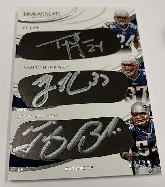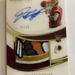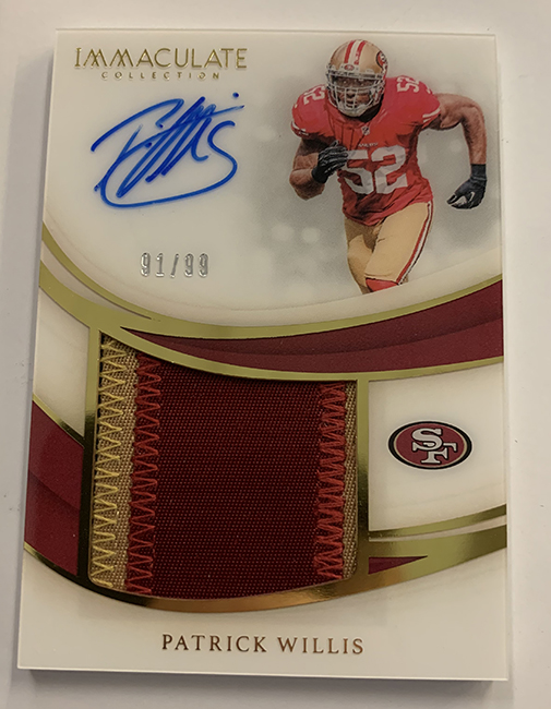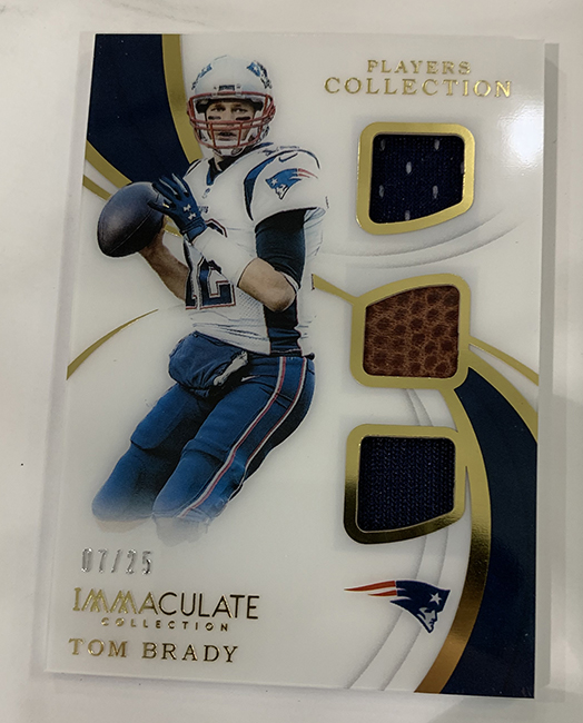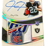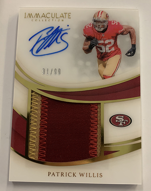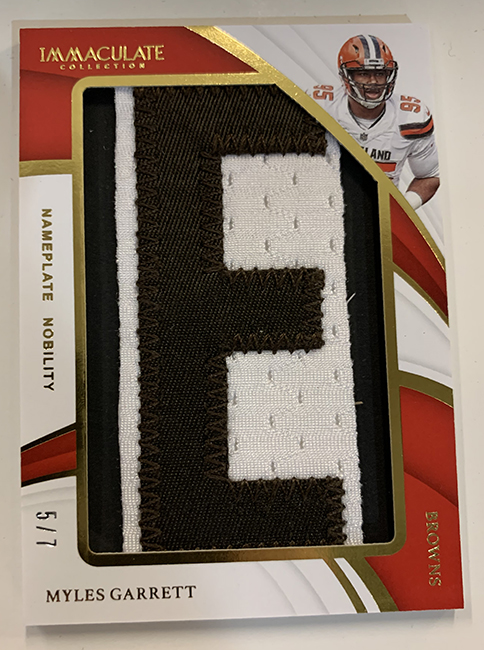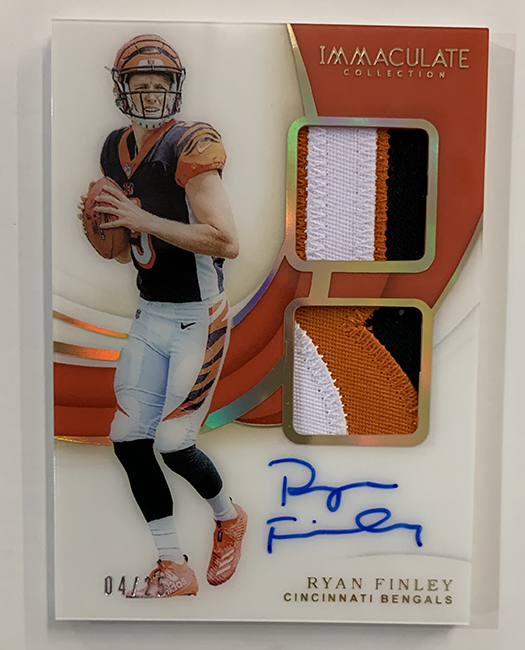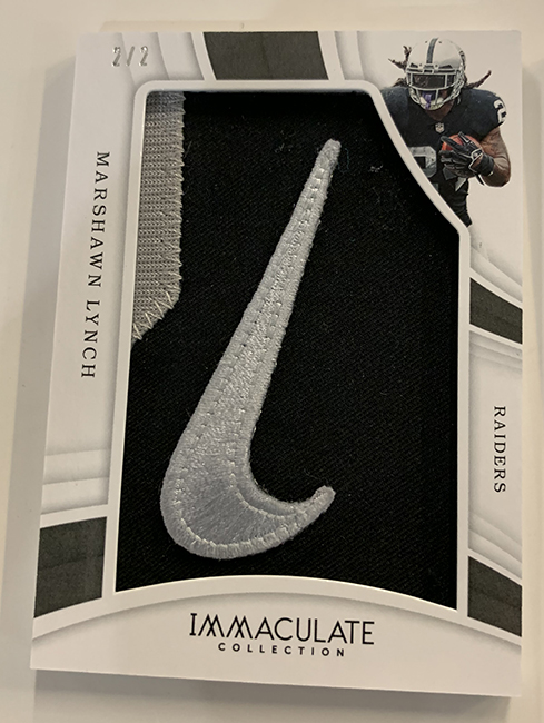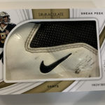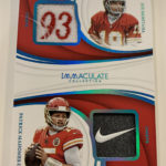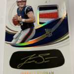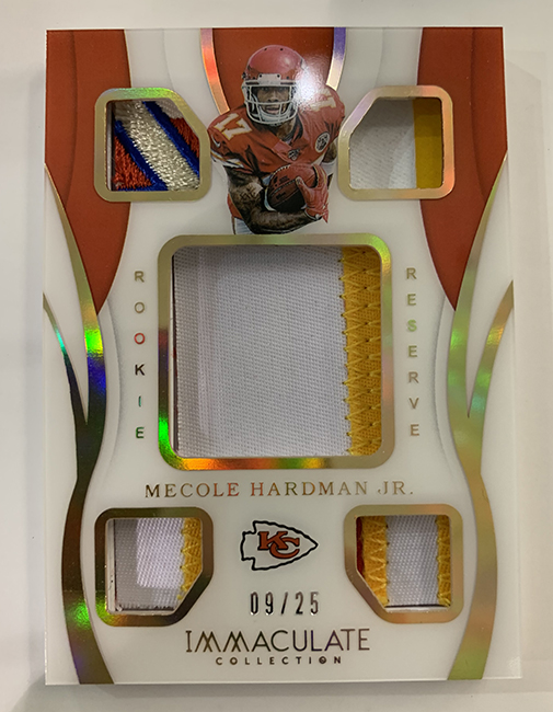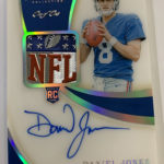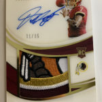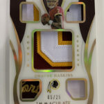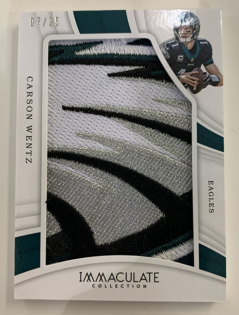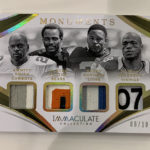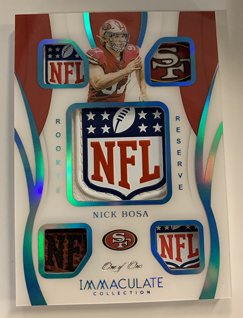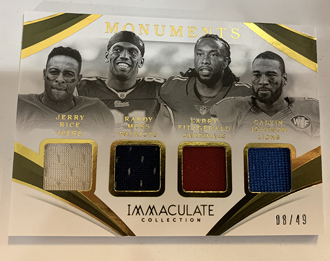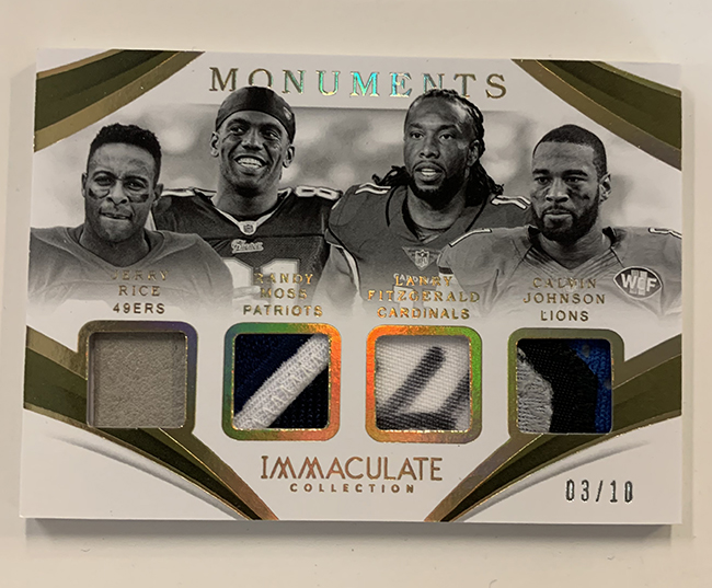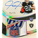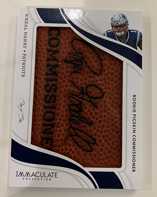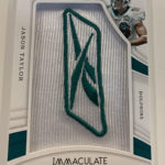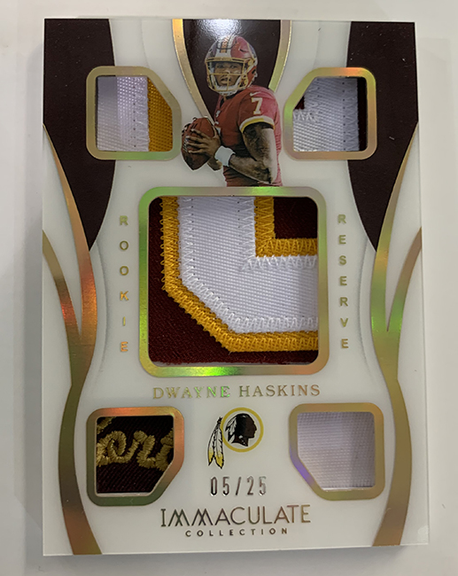 The Basics: Rookies will get their first on-card rookie patch autos in this one, according to Panini, with on-card ink to be found for the RPAs, premium patch rookies, Players Collection and Immaculate Number RPAs for starters. ... There will be a few on-card auto inserts this time around with Pro Bowl Signatures, Marks of Greatness and Draft Class Signatures, while eye black triple autos are also new inclusions. Among memorabilia cards will be the new Monuments cards (prime parallel /10) while jumbo mem cards will include team- and brand-logo cards as well as laundry tags and NFL shields for starters. ... RPAs (/99) will have parallels -- Gold (/25 max) and 1/1 Platinum tags and NFL shield cards. Premium patch rookie autographs will have the same parallels and volume, while only top players in NFL history are found in the Mark of Greatness set (/25 max). ... Joining those will be acetate autos in the Immaculate Player Collection set (/99) with parallels including Gold (/5) and 1/1 tags. ... Among the memorabilia options will be 1/1 dual NFL shields as well as Sneak Peek cards that are part of a jumbo-mem lineup that includes gloves, helmets, cleats and more with cards rarer than 25 copies apiece. New will be Rookie Reserve mem cards with five swatches per card (/25) with 1/1 cards for the brand logo and NFL shield versions. ... Boxes will once again carry a suggested retail price of $400.
