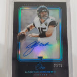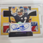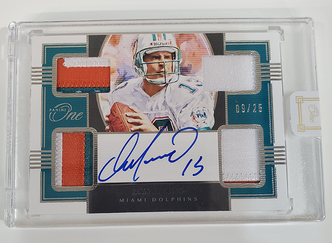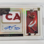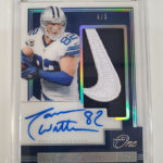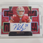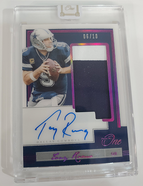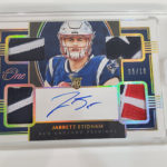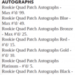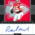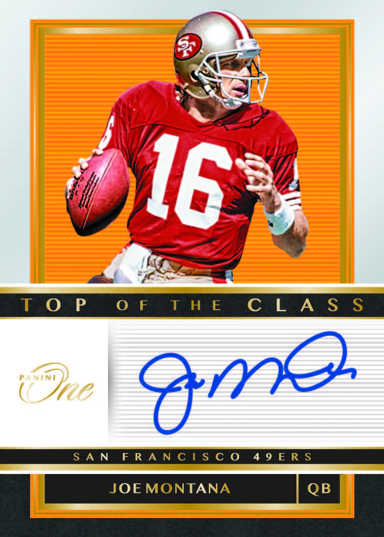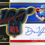 The Basics: All autos here will be on-card from "top NFL rookies, legends and current stars" in this one with some new additions that include Number Ones, Matchless, Top of the Class and One of a Kind. ... Among the patch cards will be 1/1 NFL shields and NFL 100 shields, which also will be 1/1 cards. ... Parallels in this one will include Blue, Bronze, Red, Gold, Platinum and Black with volumes varying by set -- and you can see how that breaks down for six of them in the gallery below. ... Rookie Patch Autos will have "a custom embossed card stock" and there also will be quad patch cards to be found as well as "premium" rookie patches on acetate. ... Other ink will be found on the shadowbox-style autographs set, Matchless cards and dual-patch autos that will have their ink nestled between two swatches. Joining those will be Number Ones that look back at past No. 1 picks -- cards that will be 1/1s. Top of the Class autos, which will have micro-etching, also appear to be just one copy. ... These boxes once again will carry a suggested retail price of $100.