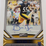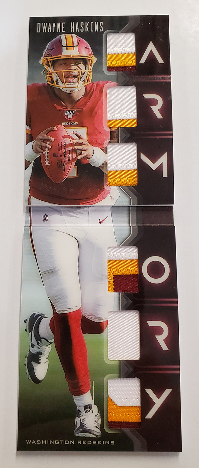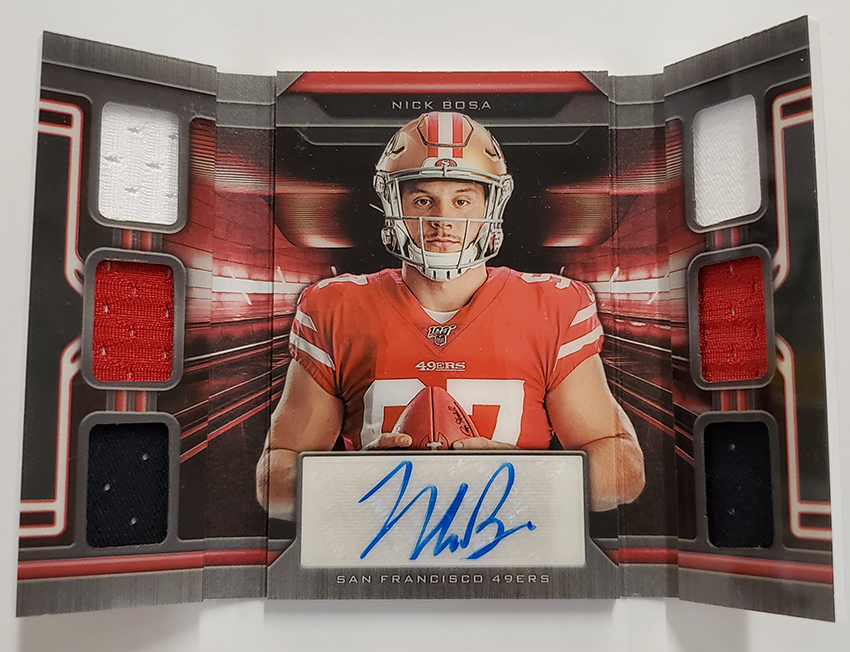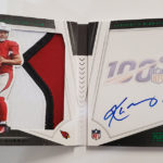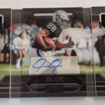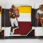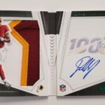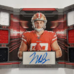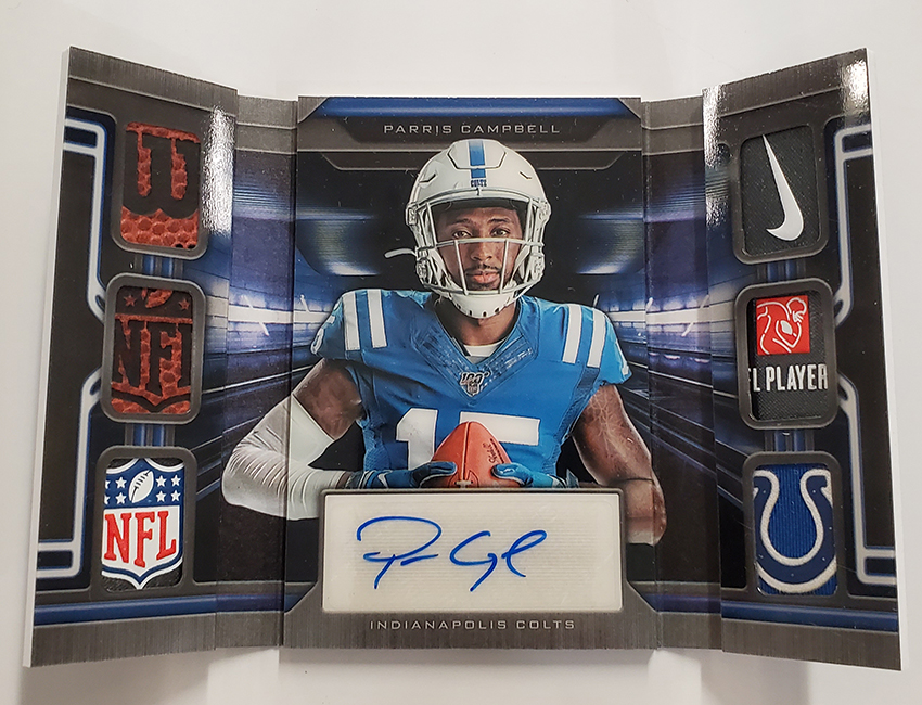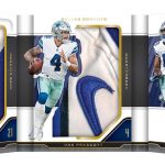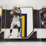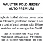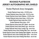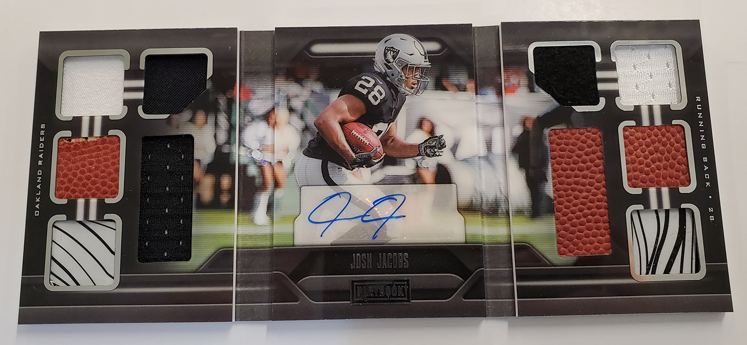 The Basics: Three out of four boxes will include an on-card Rookie Playbook Jersey auto limited to no mor ethane 249 copies as part of a lineup that includes Rookie Jumbo Memorabilia, Armory, Game of Inches, Red Zone Prime and Nexus Tri Fold Jumbo Jerseys among others. Auto books will be found in Rookies Playbook Jerseys, Playbook Materials, Front 4 Jersey Signatures, Vault Tri Fold Jerseys and Rookie Signature Lockers. ... Beyond books, there will be Signature Materials, Xs and Os Signatures, Hail Mary Signatures, Triple Threats, Hot Routes, Mammoth Material and Fabled Fabric cards to chase. ... Among the parallels will be a number of colors with Material Autos (/49), for example, having Green (/25) Red (/10) and 1/1 NFL shield, Nike Swoosh and printing plate versions in each color. Each of the sets' parallel breakdowns are in the gallery below. Rookie Signatures will include Platinum (/75), Blue (/49), Green (/25), Gold (/10), Black (/5) and 1/1 Red as well as printing plates. ... Boxes once again carry a suggested retail price of $150.