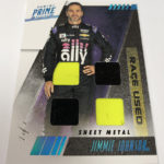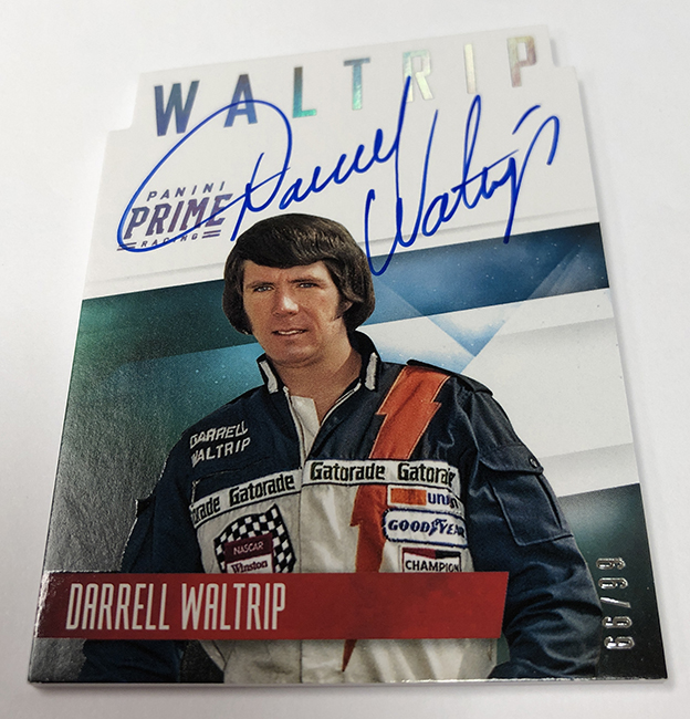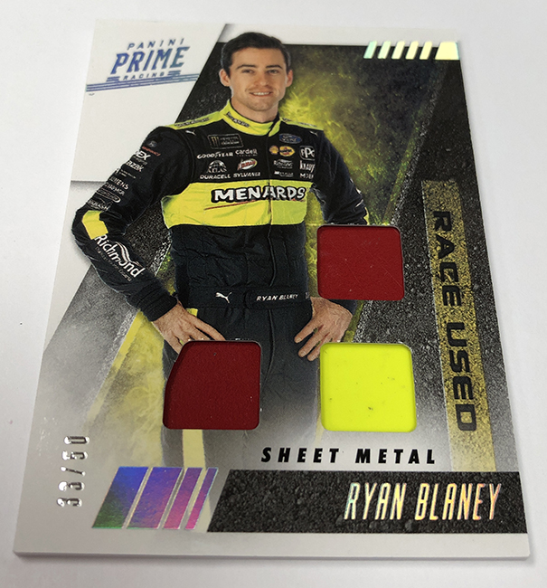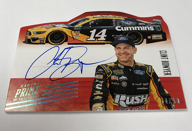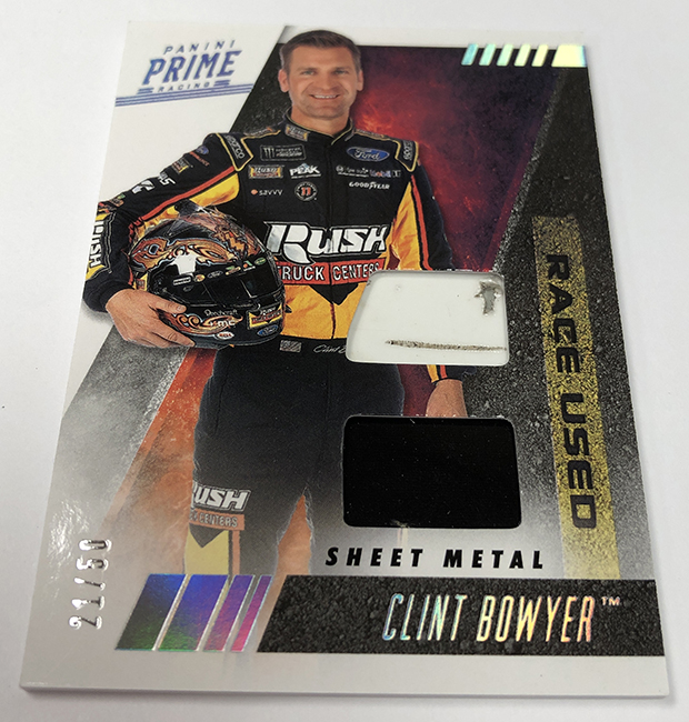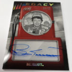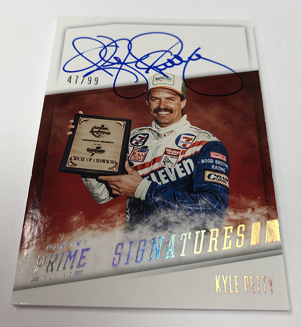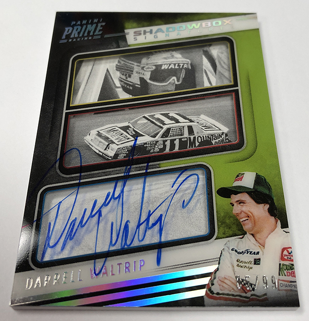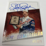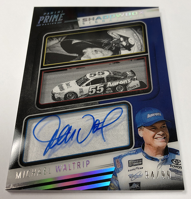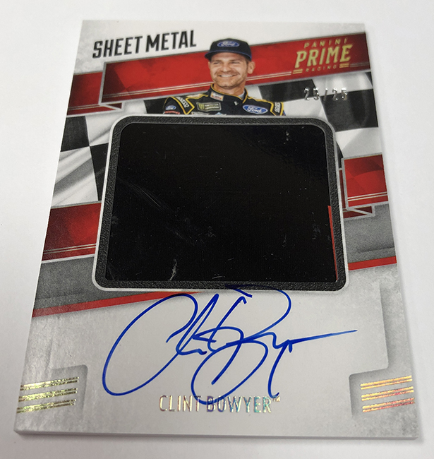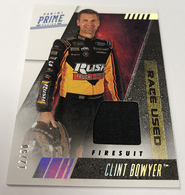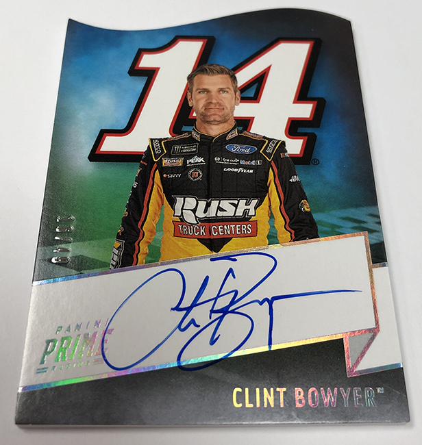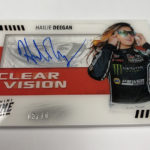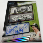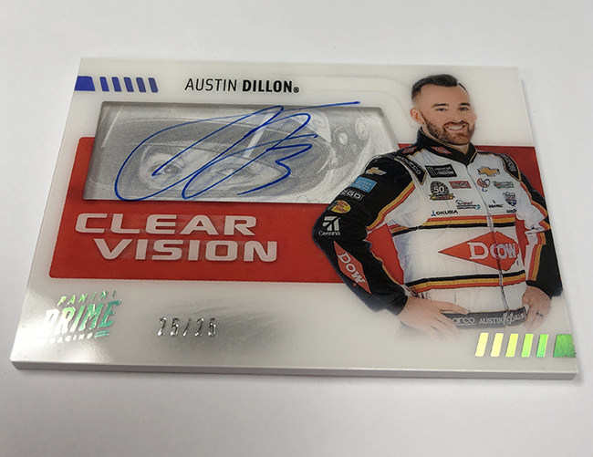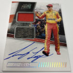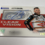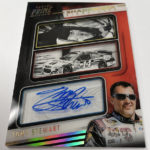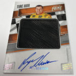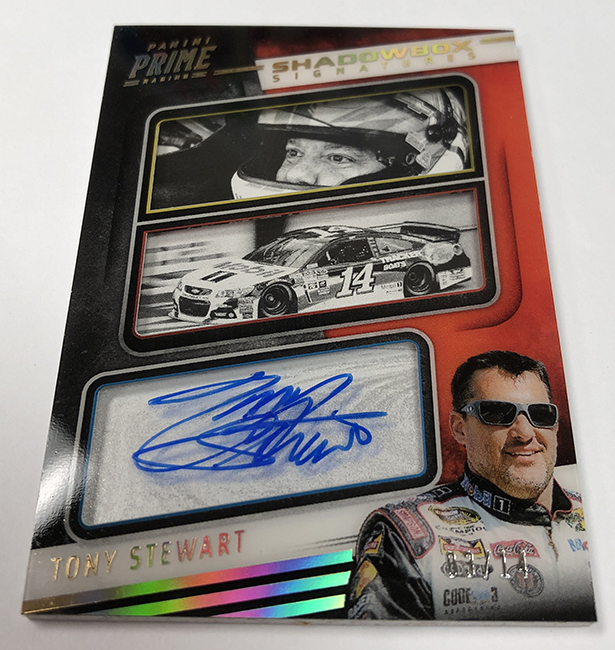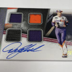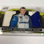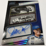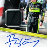 The Basics: Each box will include one base card or parallel atop the hits with as many as four memorabilia swatches per card. There will be Prime Jumbo memorabilia cards with firesuits, gloves and shoes and there also will be Clear Silhouettes (/99) cards with oversized swatches. Those will have Holo Gold (/25), Black (/10) and 1/1 Holo Platinum Blue parallels. Also in the mix will be Shadowbox Signatures (/99) that will have on-card autos and Holo Gold (/50), Black (/10) and 1/1 Blue versions. There also will be Quad Materials Autos (/99) and Autograph Materials (/99) that will have nearly the same parallels. ... Other inclusions will be Shadowbox Signatures with car number (/99 max), sponsor (/25), manufacturer (/10) and 1/1 team owner versions. Base cards will be limited to only 50 copies with Black (/10), Emerald (/5) and 1/1 Platinum Blue versions. There also will be Legacy Signatures and Clear Vision Signatures in the mix, too. ... Boxes once again carry a suggested retail price of $250.