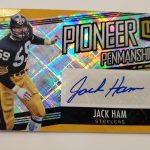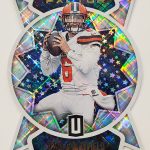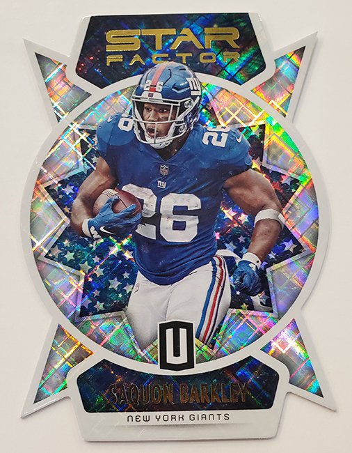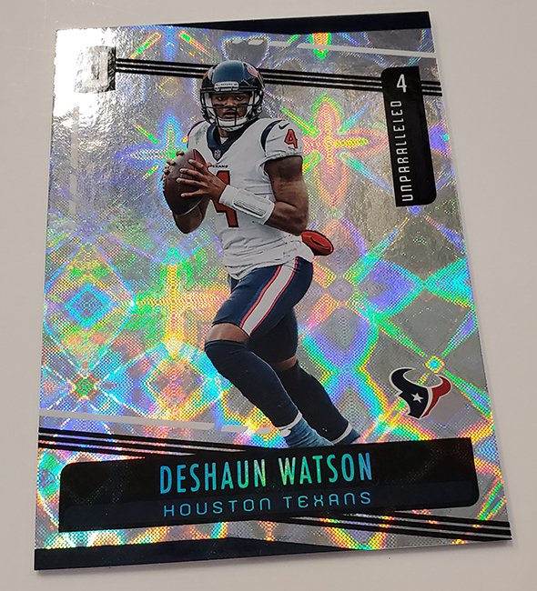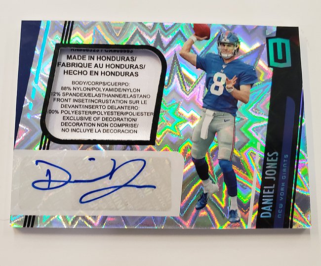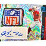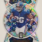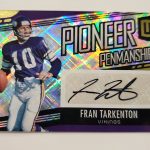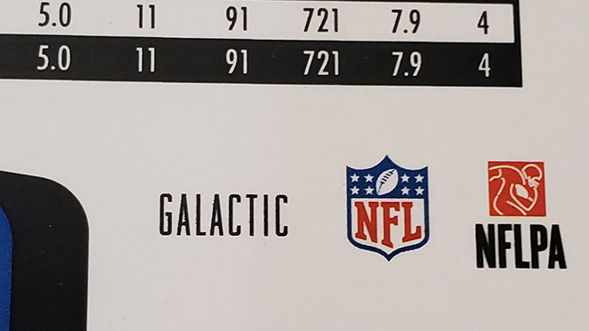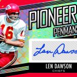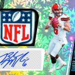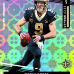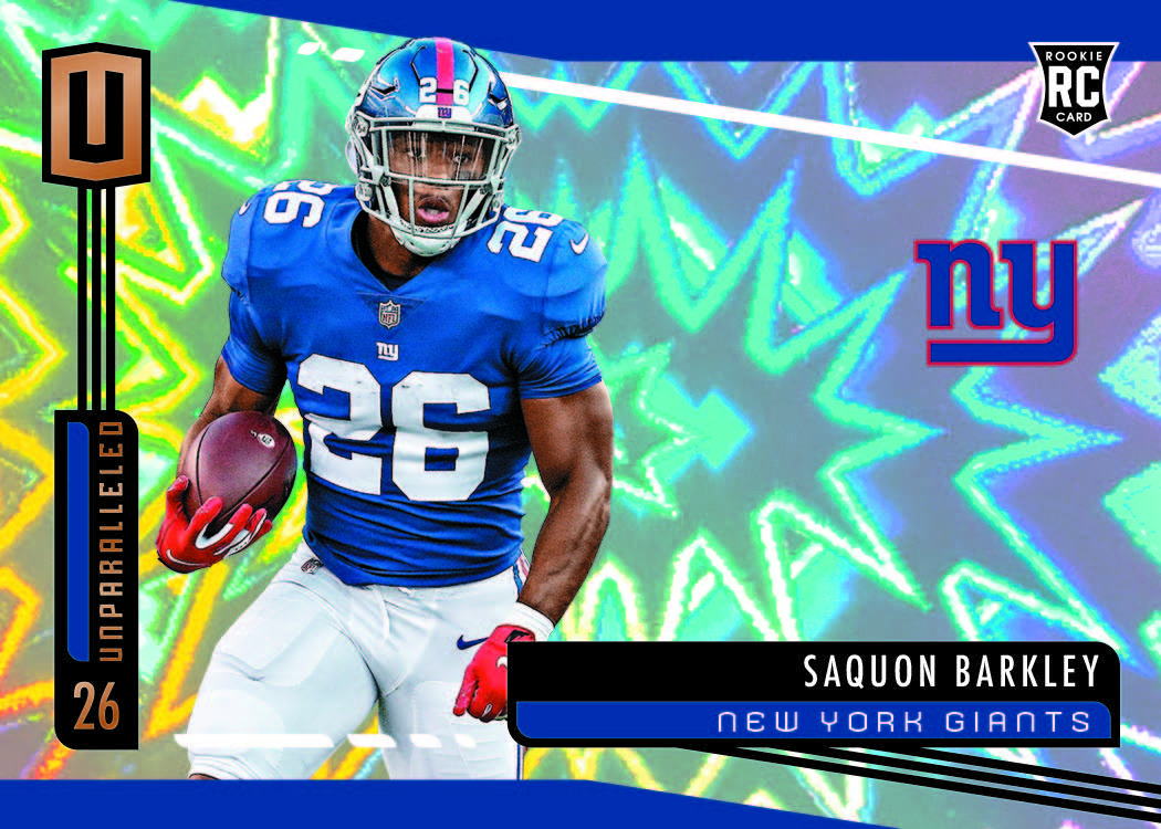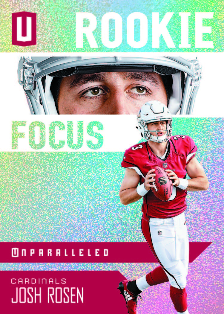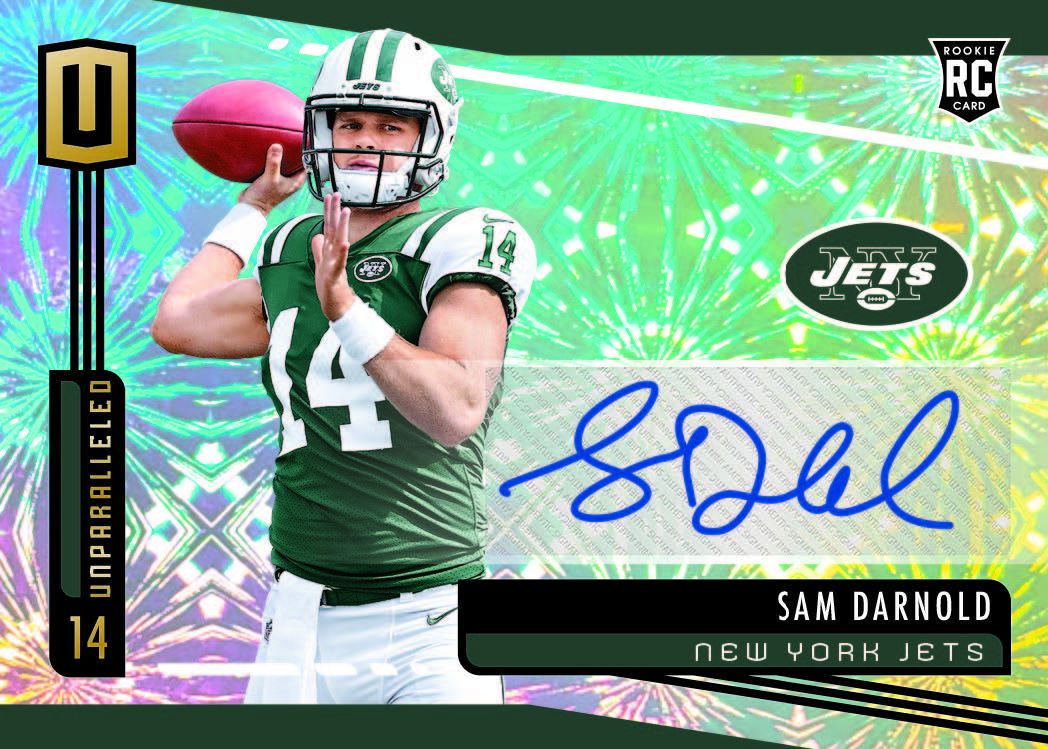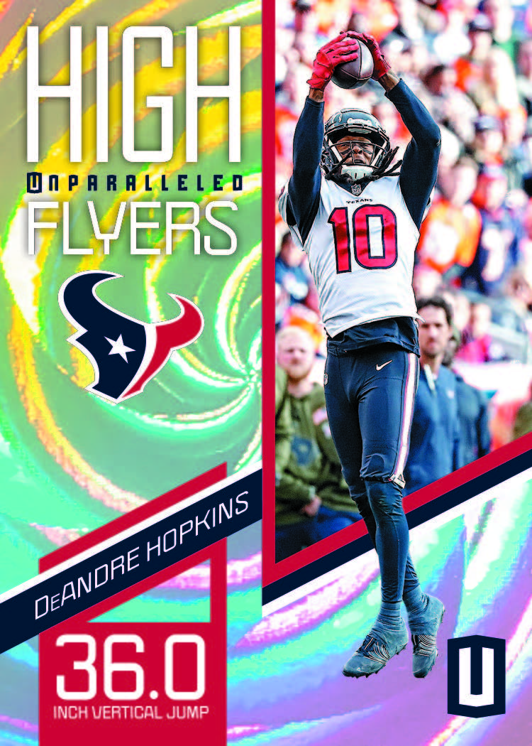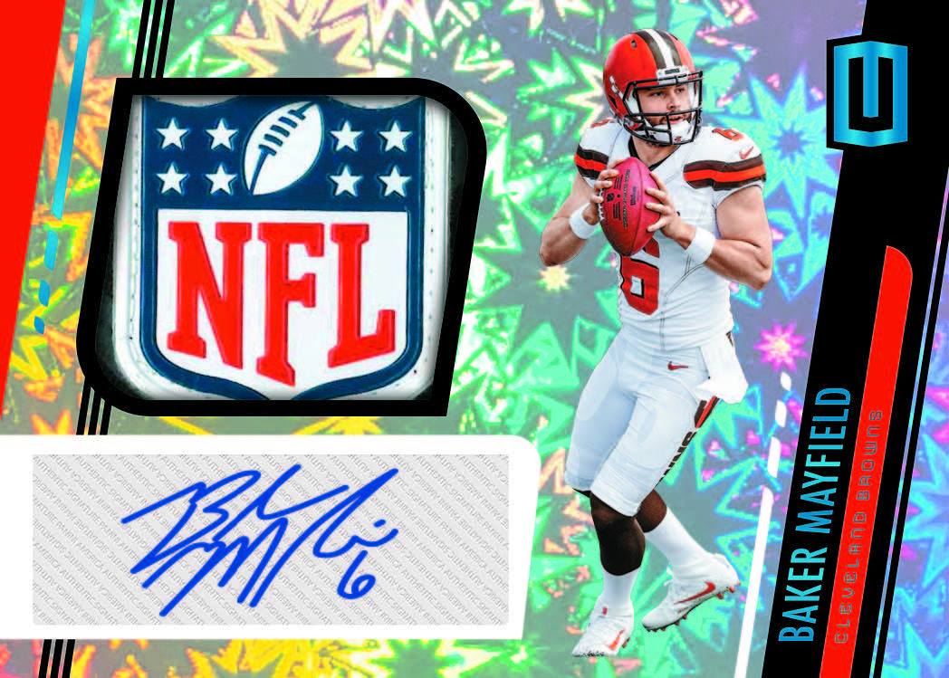 The Basics: Atop the hits, every box will include at least seven serial-numbered parallel cards just like last year. This year, the base set will have 300 cards -- 200 veterans (at least 60 of those being RCs, too) and 100 new rookies -- with the base set's parallels including Flight, Groove, Astral (/200), Infinite (/150), Whirl (/100), Impact (/75), Hyper (/25), Fireworks (/5), Burst (1/1) and Galactic (one per case). The rookies will have the same rainbow of parallels but their Galactics will be found in every other case. Standard RCs will be found two per pack. Rookie Focus cards reinforce this one's focus on newcomers with that insert set having Groove, Whirl (/100), Impact (/75), Hyper (/25) and 1/1 Burst versions. ... Rookie Jersey autos will have Astral (/150 max), Impact (/75), Hyper (/25), Fireworks (/5) and 1/1 Burst versions as well as NFL Shield, Tag and NFL Shield Logo versions that all will be 1/1s. ... Pioneer Penmanship autos will be back once again with a focus on past greats -- guys from the 1950s to 1990s -- with all limited to no more than 99 copies. ...Rookie Signatures will have fewer parallels -- Hyper (/25), Fireworks (/5) and 1/1 Burst -- while Undeniable Impact memorabilia cards will spotlight just 30 players with Astral, Impact, Hyper, Fireworks and Burst versions. ... Inserts will include High Flyers and Star Factors diecuts that are one per case as well as The Thrill of Victory, Spirit of the Game, Rookie Revue and On the Rise. Packs carry a suggested retail price of $12 ($96 per box).