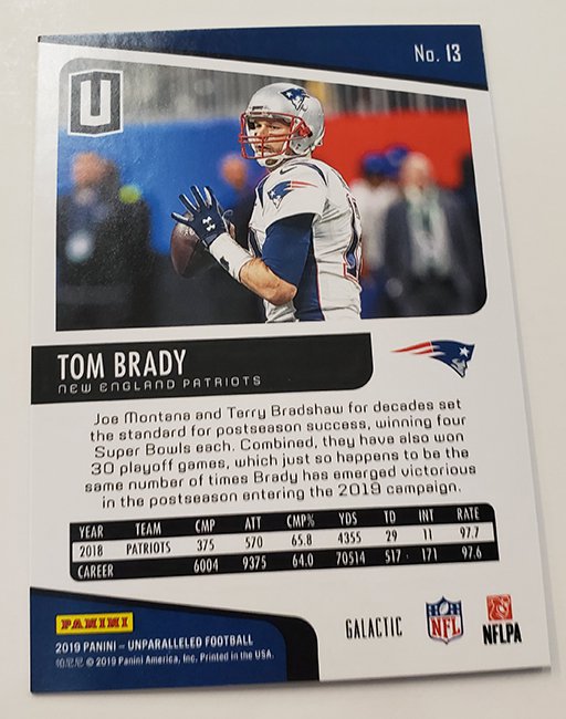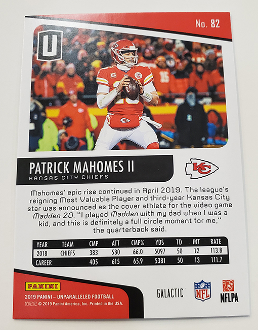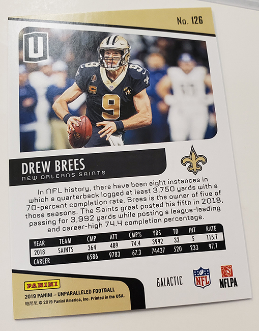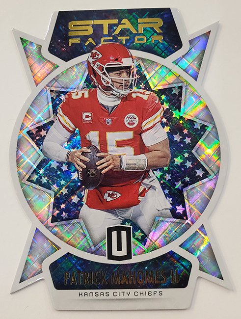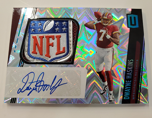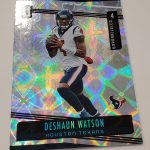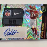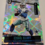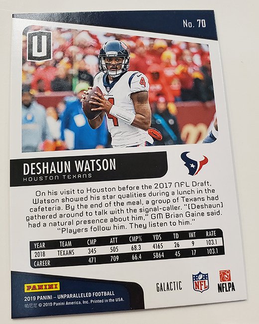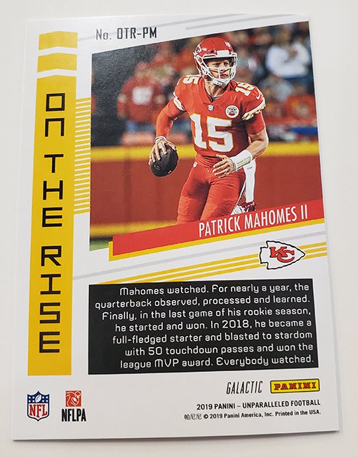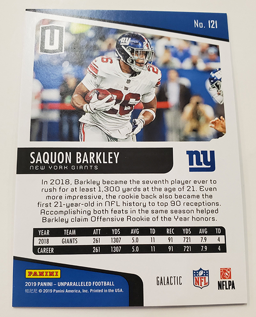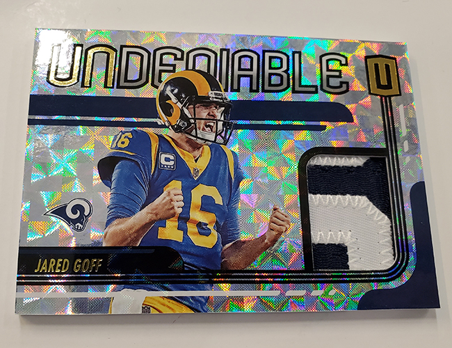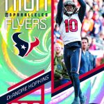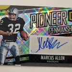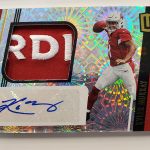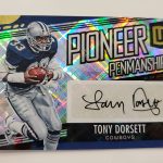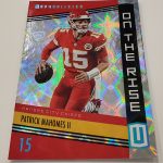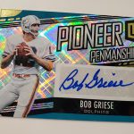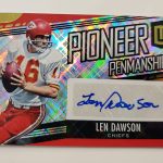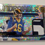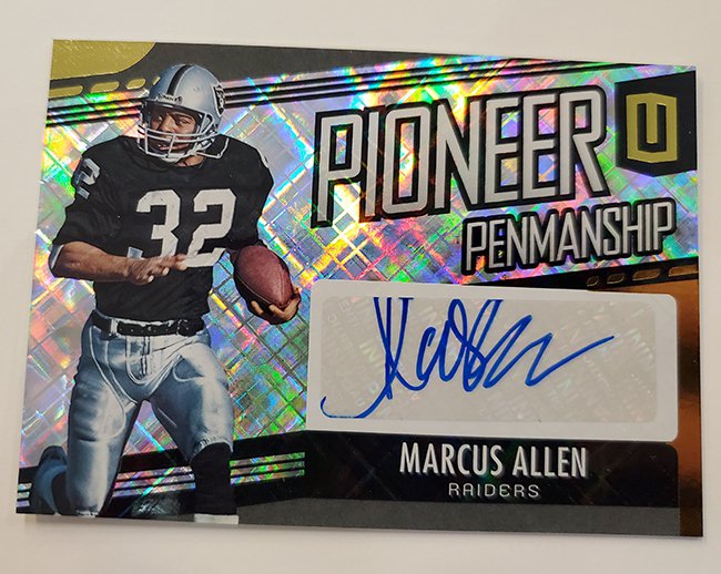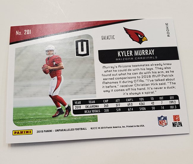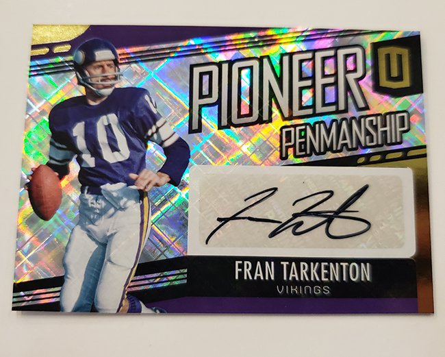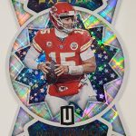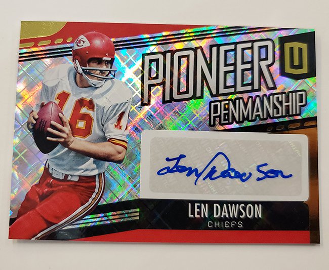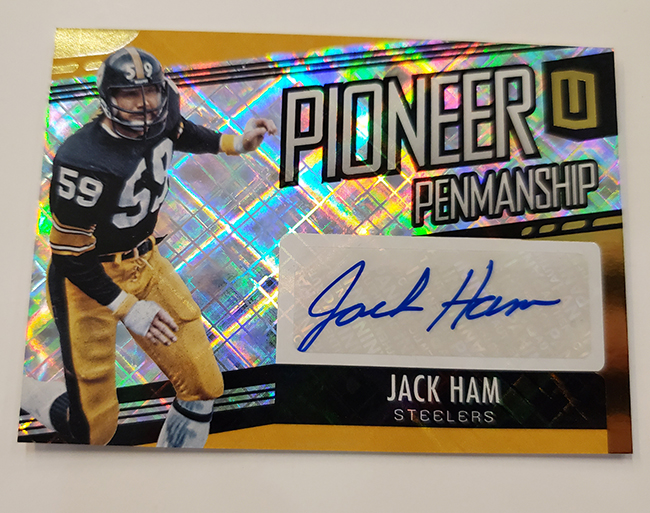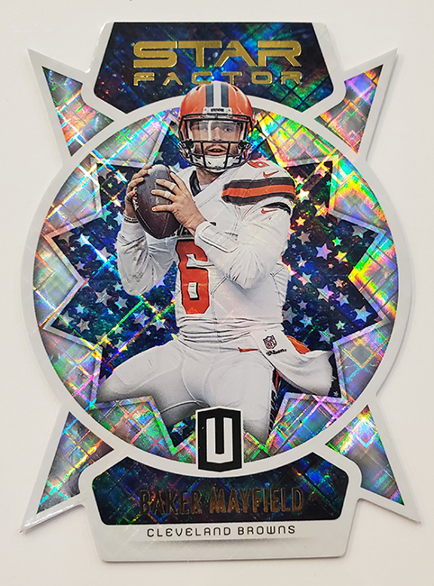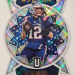 The Basics: Atop the hits, every box will include at least seven serial-numbered parallel cards just like last year. This year, the base set will have 300 cards -- 200 veterans (at least 60 of those being RCs, too) and 100 new rookies -- with the base set's parallels including Flight, Groove, Astral (/200), Infinite (/150), Whirl (/100), Impact (/75), Hyper (/25), Fireworks (/5), Burst (1/1) and Galactic (one per case). The rookies will have the same rainbow of parallels but their Galactics will be found in every other case. Standard RCs will be found two per pack. Rookie Focus cards reinforce this one's focus on newcomers with that insert set having Groove, Whirl (/100), Impact (/75), Hyper (/25) and 1/1 Burst versions. ... Rookie Jersey autos will have Astral (/150 max), Impact (/75), Hyper (/25), Fireworks (/5) and 1/1 Burst versions as well as NFL Shield, Tag and NFL Shield Logo versions that all will be 1/1s. ... Pioneer Penmanship autos will be back once again with a focus on past greats -- guys from the 1950s to 1990s -- with all limited to no more than 99 copies. ...Rookie Signatures will have fewer parallels -- Hyper (/25), Fireworks (/5) and 1/1 Burst -- while Undeniable Impact memorabilia cards will spotlight just 30 players with Astral, Impact, Hyper, Fireworks and Burst versions. ... Inserts will include High Flyers and Star Factors diecuts that are one per case as well as The Thrill of Victory, Spirit of the Game, Rookie Revue and On the Rise. Packs carry a suggested retail price of $12 ($96 per box).