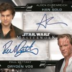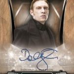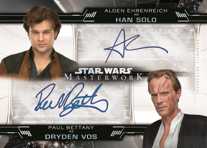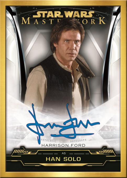 The Basics: Each box will once again include four five-card packs (a mini box) with two base cards, one parallel, one insert and one hit. Two autos will be found per box and one of those will be an on-card sig. ... For the base cards, it's again a 100-card set with 72-point stock used. Parallels will include Blue (one per pack), Green (/99), Purple (/50), Orange (/10), Black (/5) and 1/1 Gold as well as printing plates just like last year. ... There will be three insert sets this time around with Defining Moments, Heroes of the Rebellion and The Dark Side each having Rainbow Foil (/299), Canvas (/25), Wood (/10), Metal (/5) and 1/1 Gold Metal parallels as well as printing plates. ... Ink will be found for more than 60 actors throughout the franchise's universe with a number of parallels -- Blue (/99), Rainbow (/50), Canvas (/25), Wood (/10), Silver Framed (/5) and 1/1 Gold Framed ... and printing plates, too. ... There will be dual (/50), triple (/25) and quad (/2) autos in this one along with 1/1 Pen Relics. Dual parallels will include Canvas (/25), Wood (/10), Black (/5) and 1/1 Gold versions, whole triples will have Wood, Black and Gold at the same volumes. Quads will not be paralleled. ... A new big inclusion will be The Ultimate Autograph Book Card with 40 autos in one booklet. ... Other hits will include Artifact Medallion cards with and without autos that will have Purple (/50), Orange (/10), Black (/5) and 1/1 Gold parallels for both sets as well as 1/1 film cel Relics and jumbo costume Relics that will have Orange, Black and Gold versions.